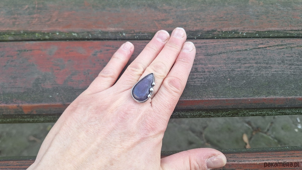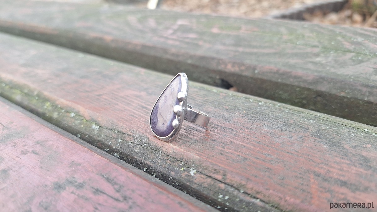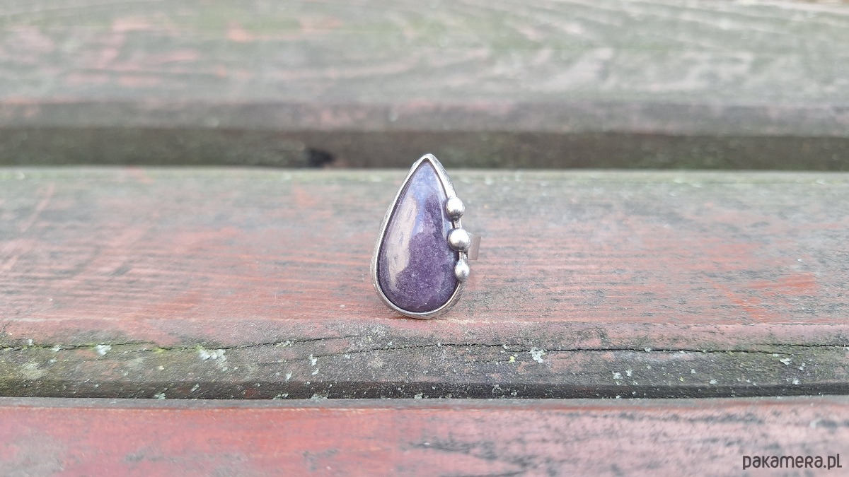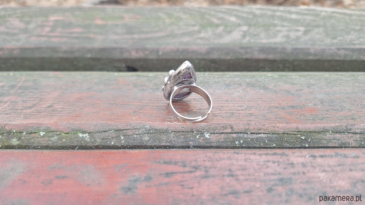 Pierścionek wykonany z miedzi, cyny i lepidolitu. Wymiary ok. 2.5 na 1.5 cm. Regulowany. Nie jest ciężki.