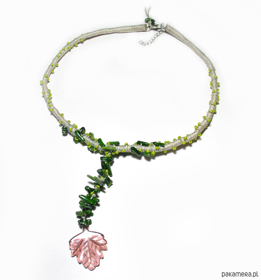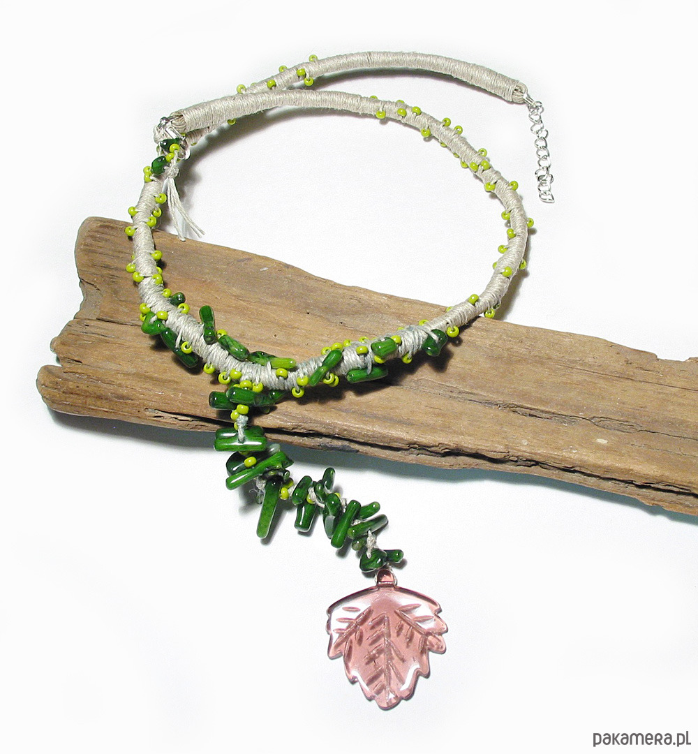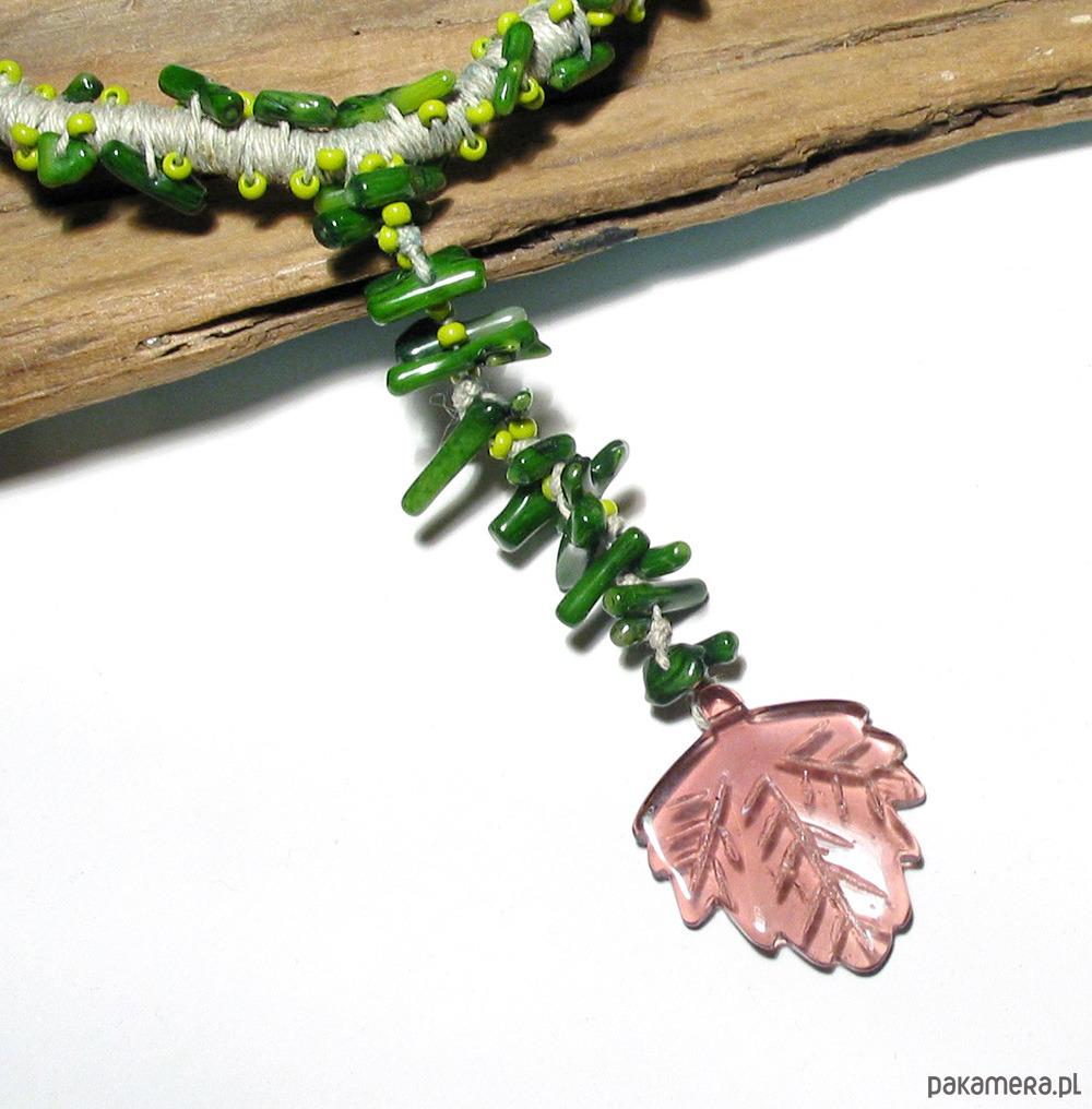 Autorski naszyjnik wykonany na splocie naturalnej polskiej przędzy lnainej. Dzięki ścisłemu splotowi utrzymuje kształt kolii. Kolorystyka soczystej zieleni nawiązuje do runa leśnego, u dolu naszyjnika znajduje się wisior zakończony weneckim szklanym listkiem w odcieniu ametystowym. W splocie znajdują elemety szklane i koralowiec. Długość ok. 46 cm + długość wisiora ok. 10 cm, regulacja długości, zapięcie posrebrzane.