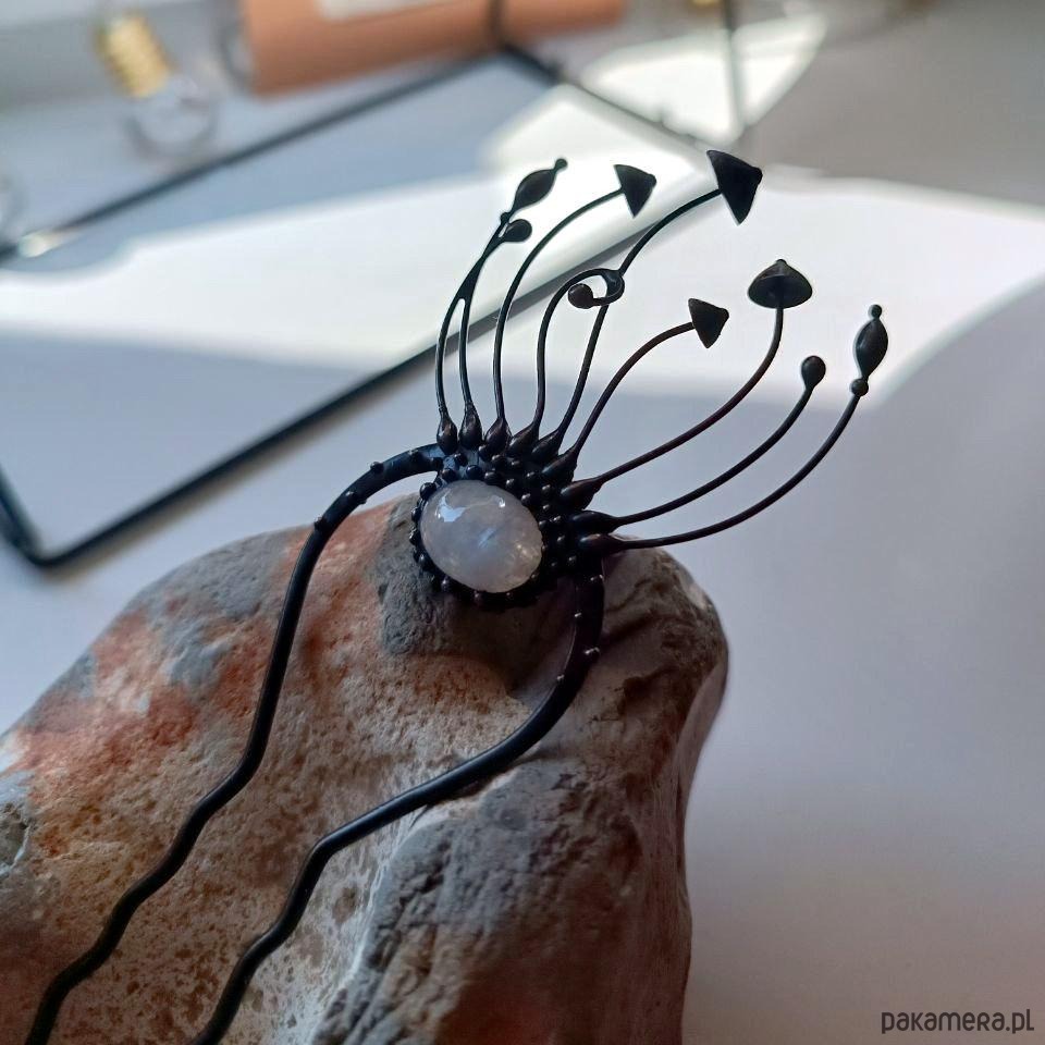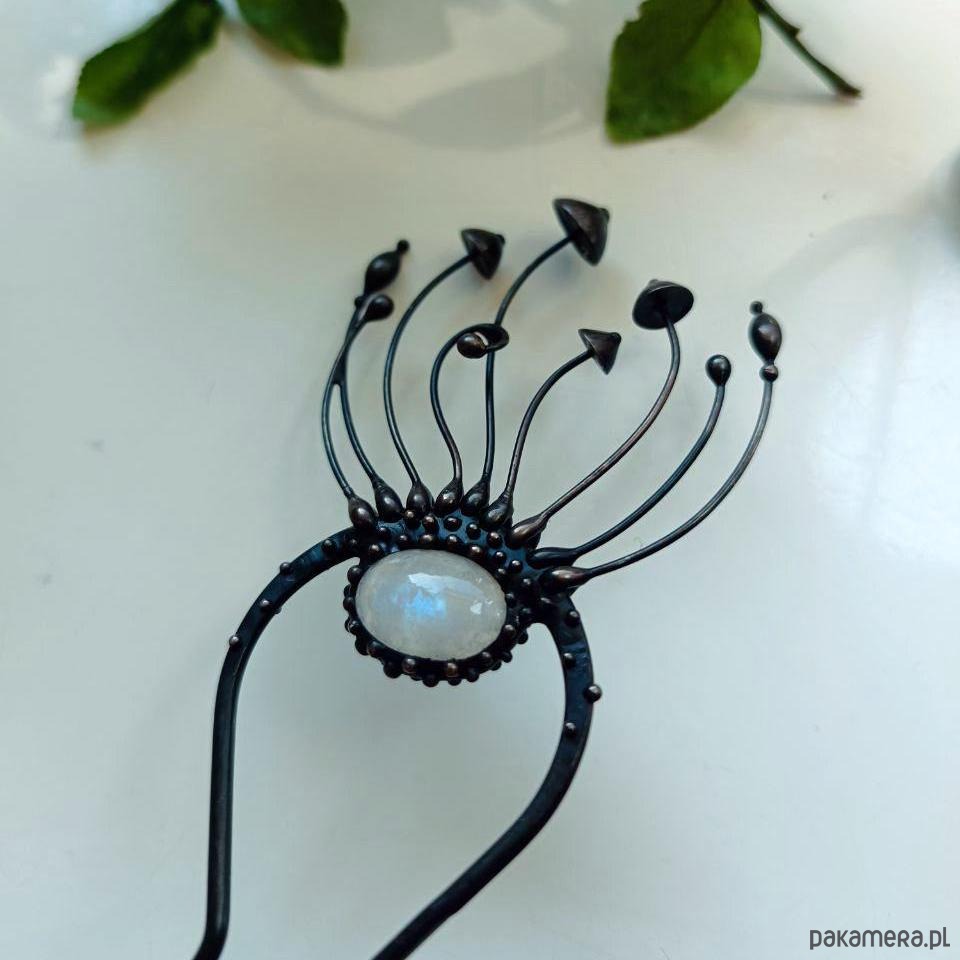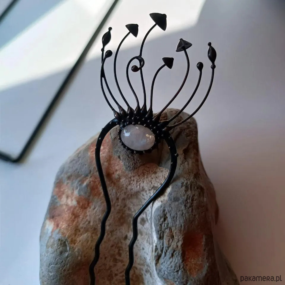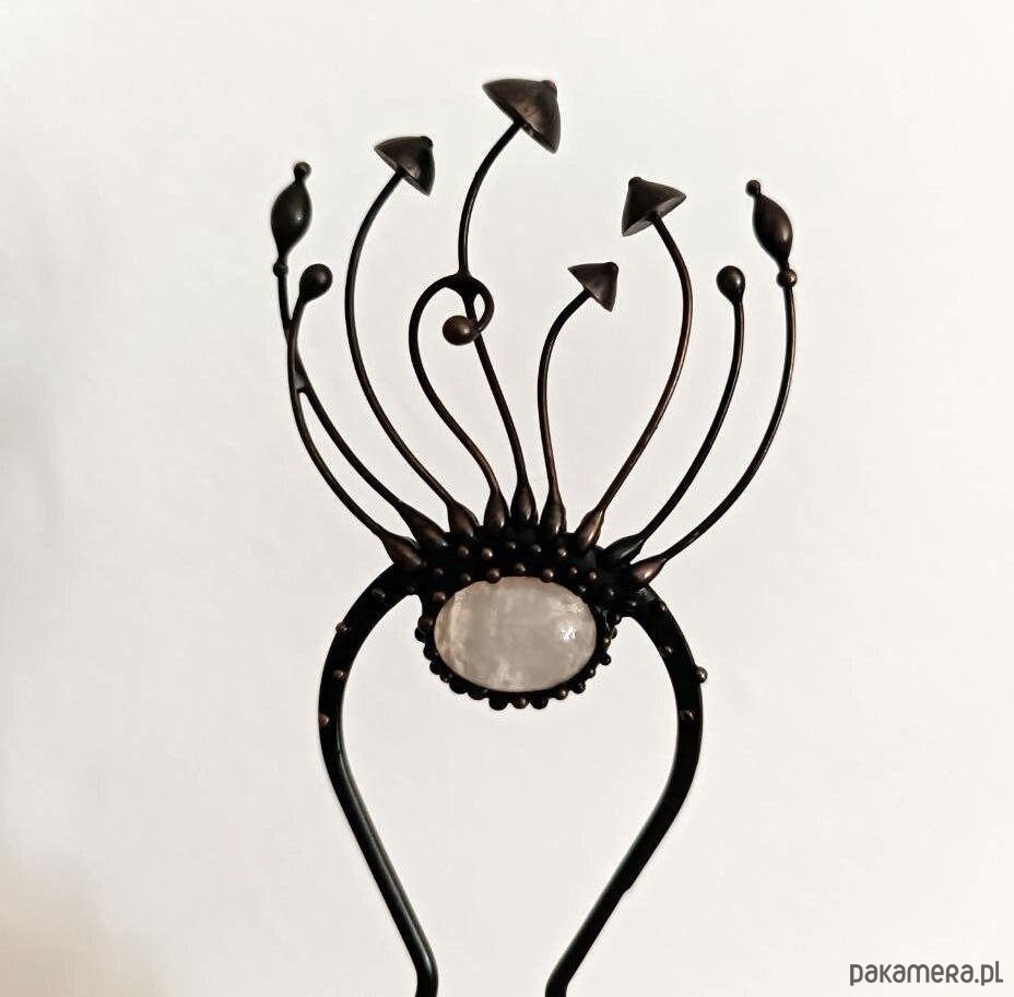 Mistyczna leśna czarna metalowa grzybowa spinka do włosów wykonana ręcznie z miedzi, cyny, stali i białego kamienia księżycowego. Pokryta czarną patyną, pokryta środkiem przeciwutleniającym, szlifowana, polerowana. Niezwykła i solidna, wyjątkowa leśna spinka do włosów w kształcie grzyba. Wszystkie elementy są wykonane ręcznie, co zapewnia indywidualność każdego produktu wytworzonego w warsztacie Yadovito. Stop cyny i miedzi jest polerowany roztworem wykończeniowym, aby nadać biżuterii szlachetny wygląd, a jednocześnie zapobiec utlenianiu się metalu.