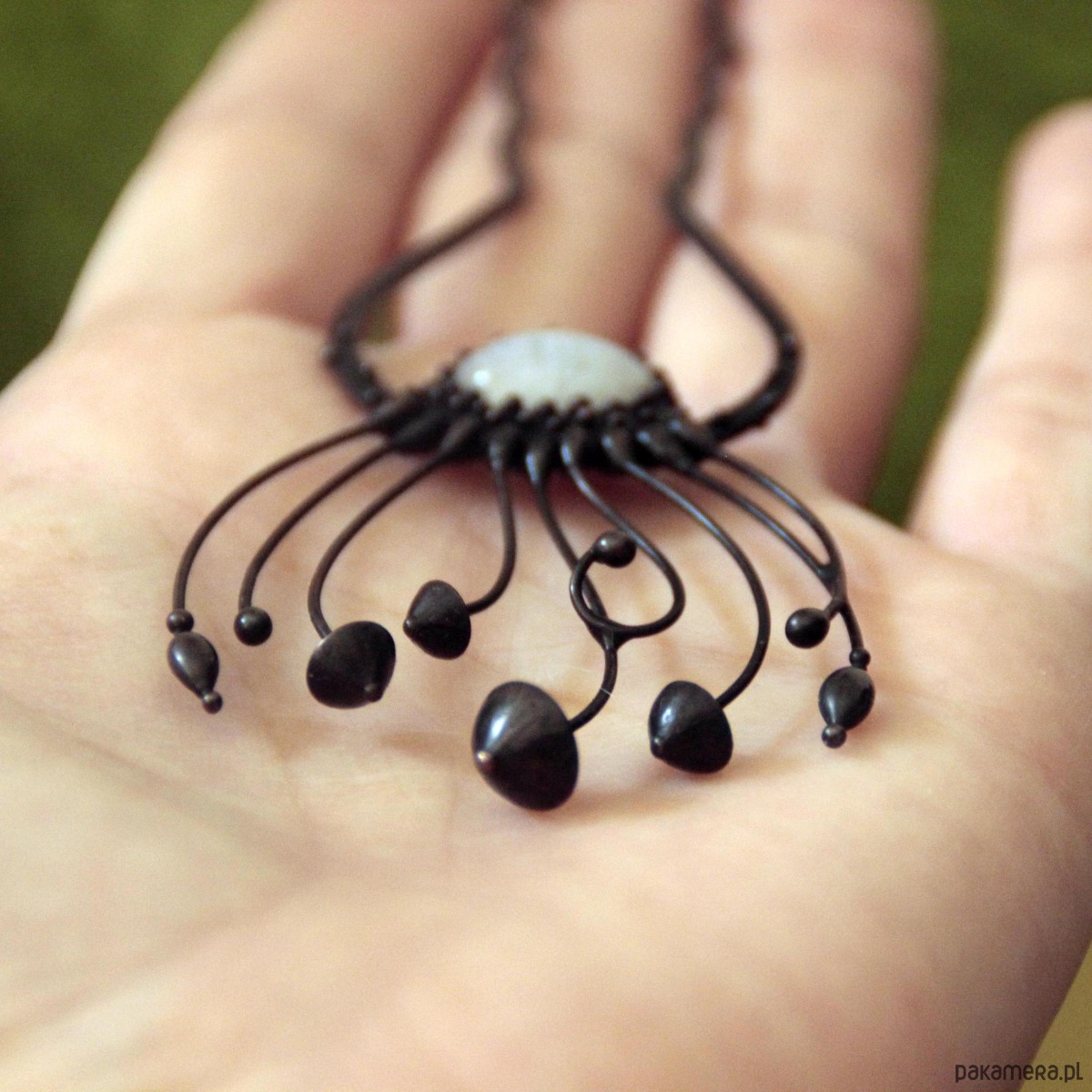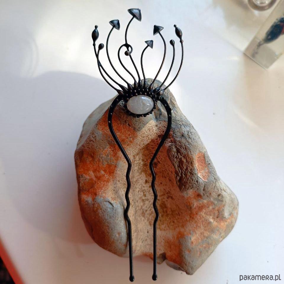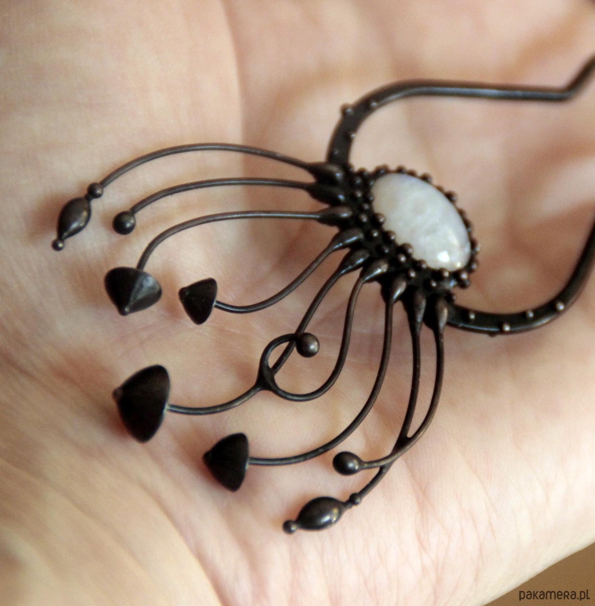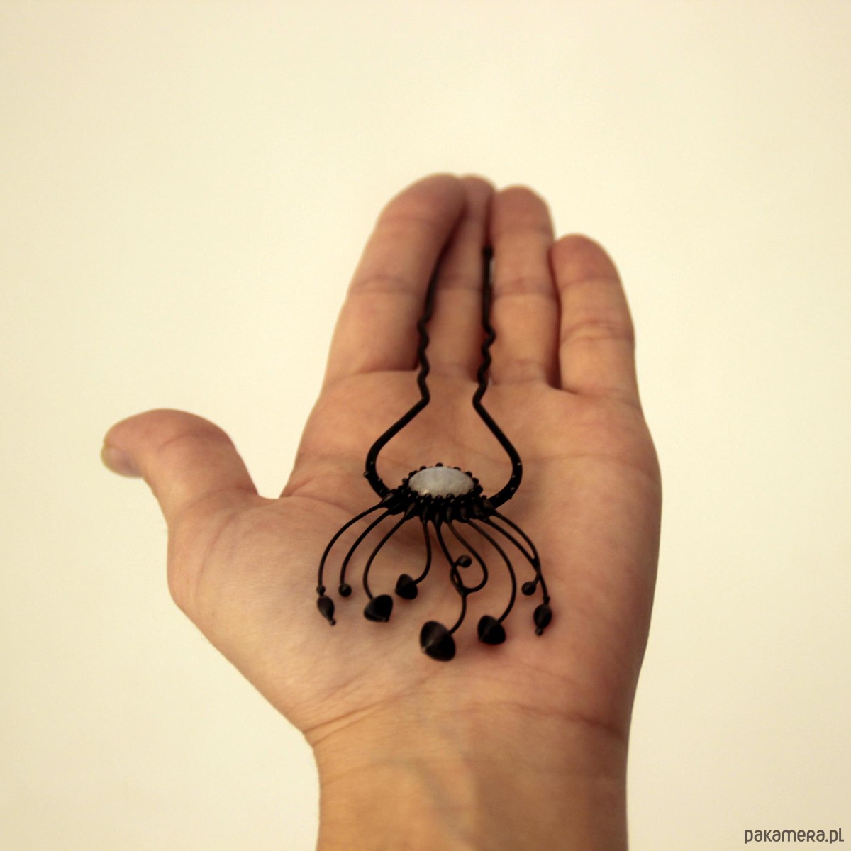 Mistyczna leśna czarna metalowa grzybowa spinka do włosów wykonana ręcznie z miedzi, cyny, stali i białego kamienia księżycowego. Pokryta czarną patyną, pokryta środkiem przeciwutleniającym, szlifowana, polerowana. Niezwykła i solidna, wyjątkowa leśna spinka do włosów w kształcie grzyba. Wszystkie elementy są wykonane ręcznie, co zapewnia indywidualność każdego produktu wytworzonego w warsztacie Yadovito. Stop cyny i miedzi jest polerowany roztworem wykończeniowym, aby nadać biżuterii szlachetny wygląd, a jednocześnie zapobiec utlenianiu się metalu.