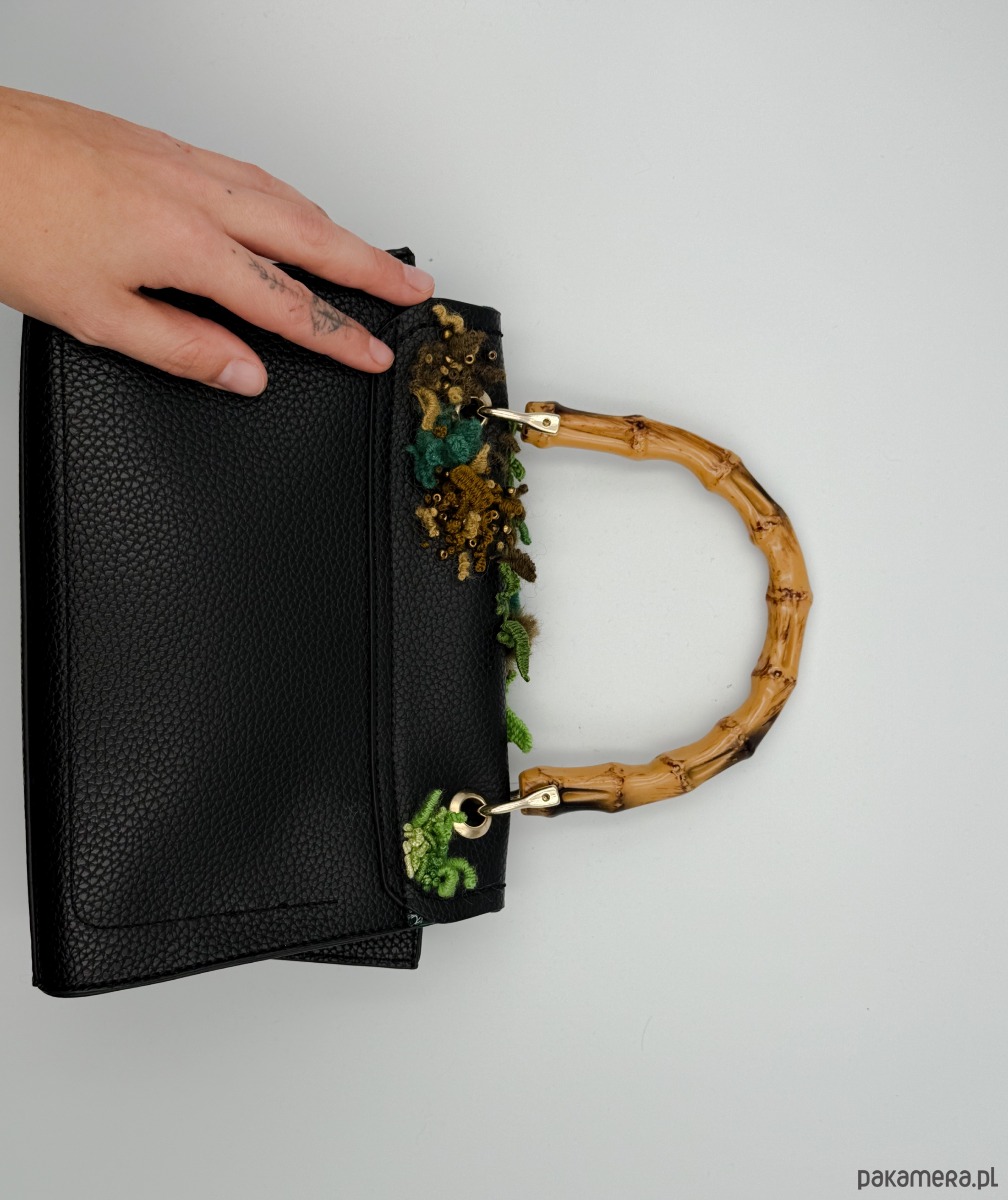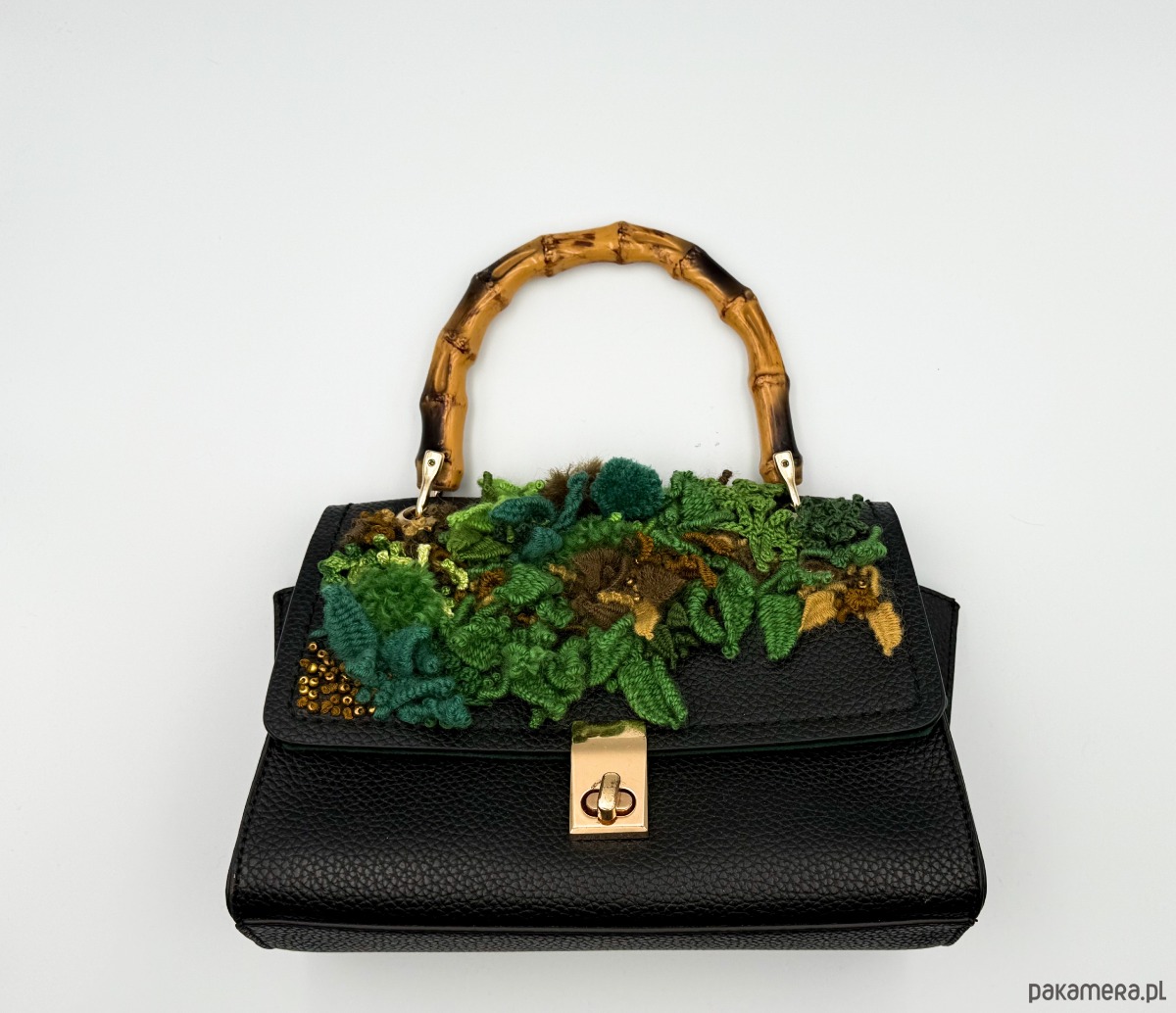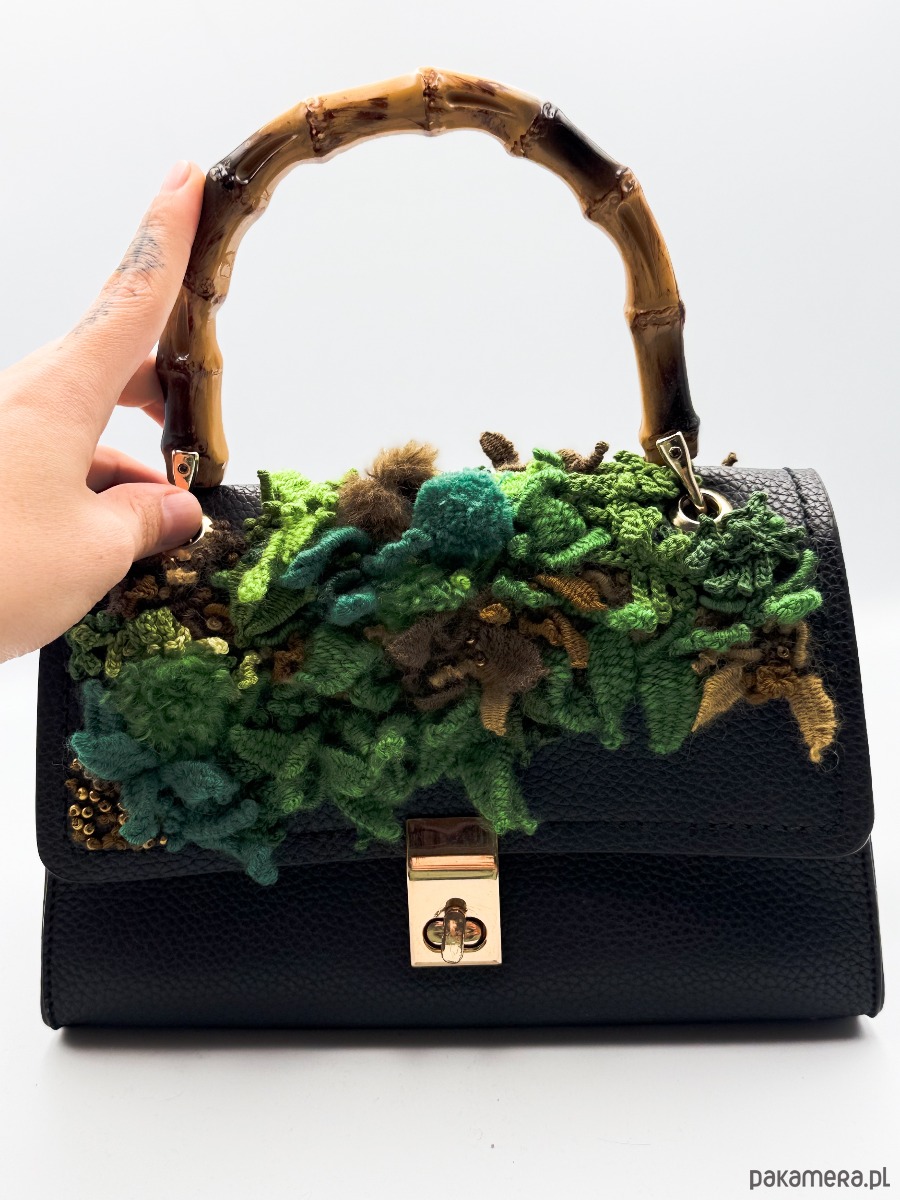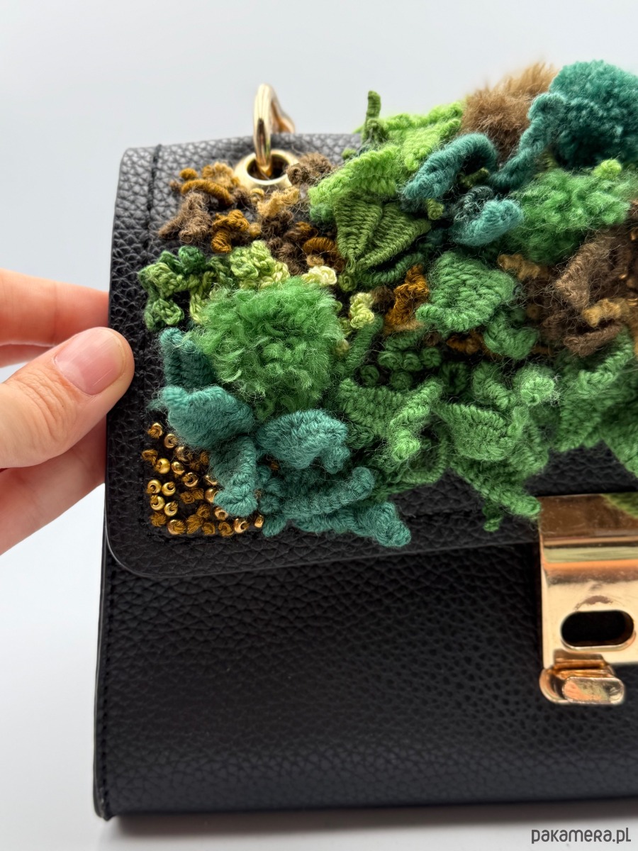 Tę torebkę upcyklingowałam właśnie z taką intencją - by była małym, codziennym wsparciem. Kiedy trzeba zachować spokój, kojąca zieleń haftowanych mchów i paproci pomaga wrócić do siebie. Puszyste zwoje zapraszają do dotyku i relaksu, a rączka imitująca drewno pewnie i wygodnie leży w dłoni. Czasem nie potrzebujemy amuletu – wystarczy przedmiot, który cicho przypomina o harmonii. Zjawiskowa, ale spokojna.