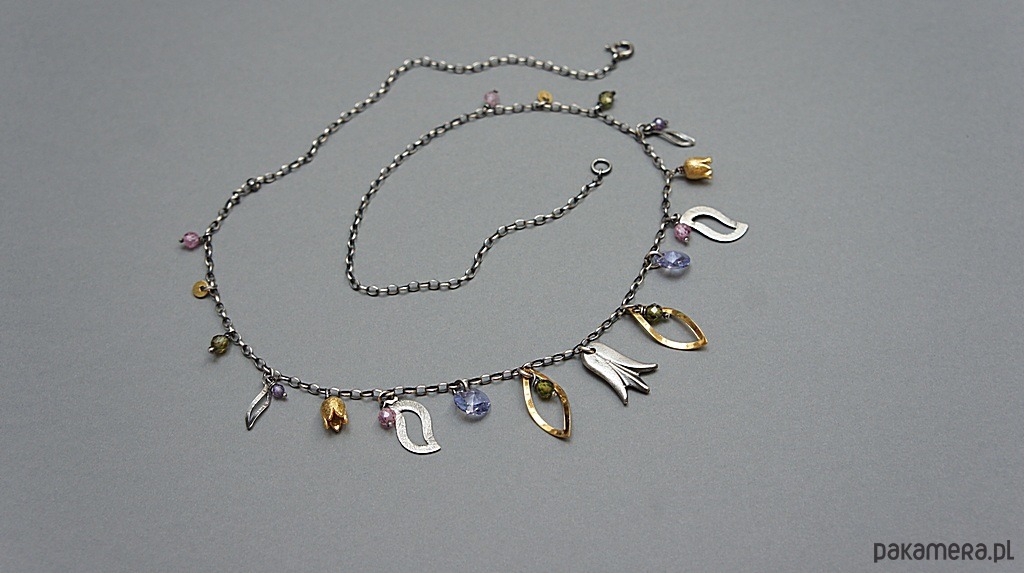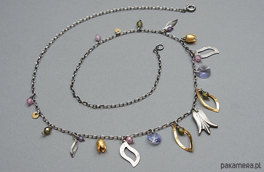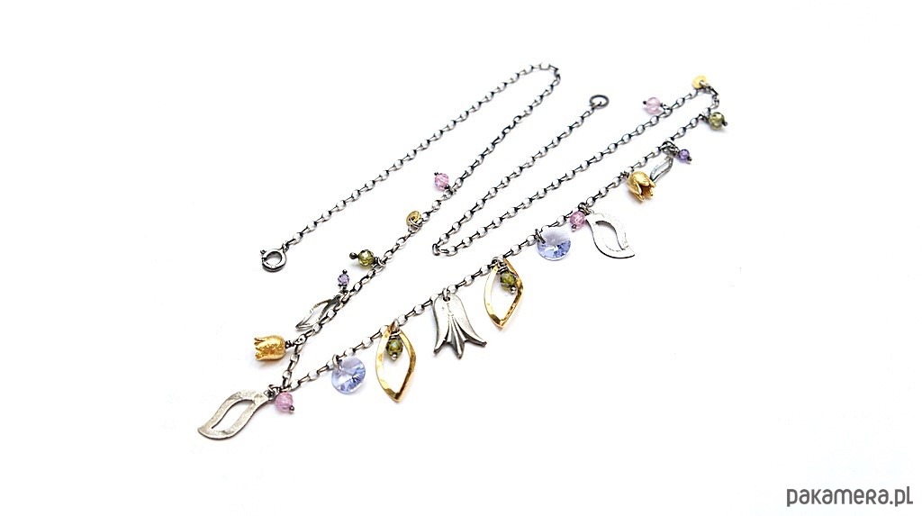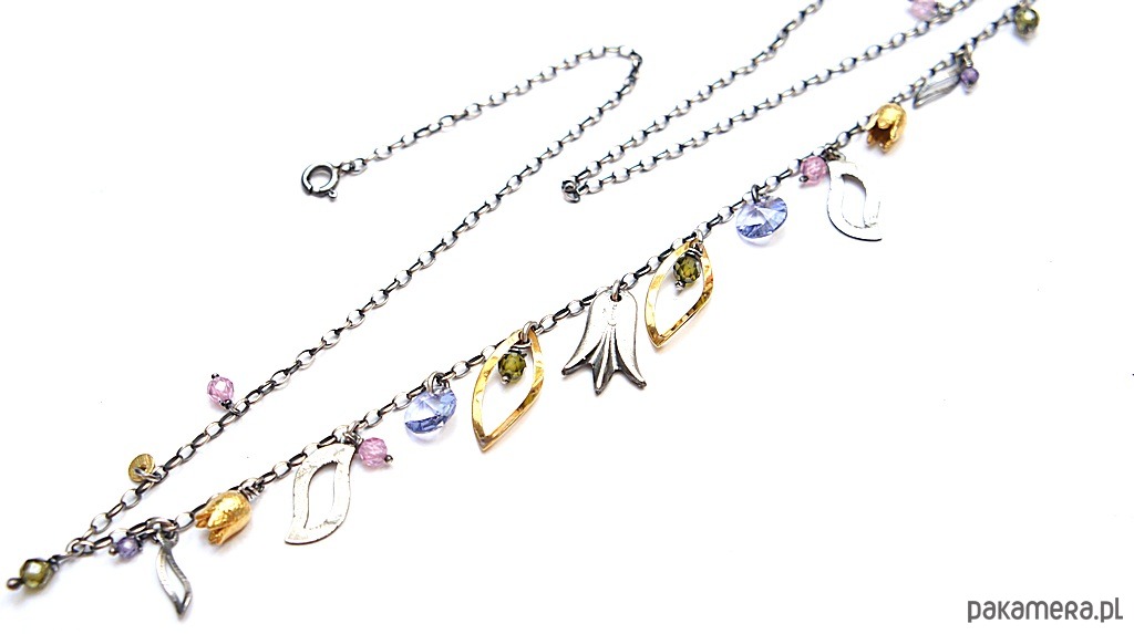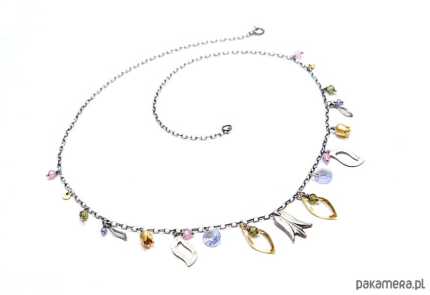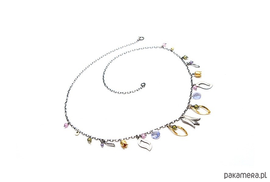 Krótki naszyjnik - choker wykonany ze srebra i srebra pokrytego 24k złotem [pr. 925] w połączeniu z cyrkoniami [4mm i 3mm], kryształkami Swarovski [8mm i 4mm] oraz srebrnymi blaszkami i dzwonkami. Srebro częściowo oksydowane i przetarte. Całkowita długość naszyjnika około 53,5 cm. Biżuteria ozdobnie zapakowana.