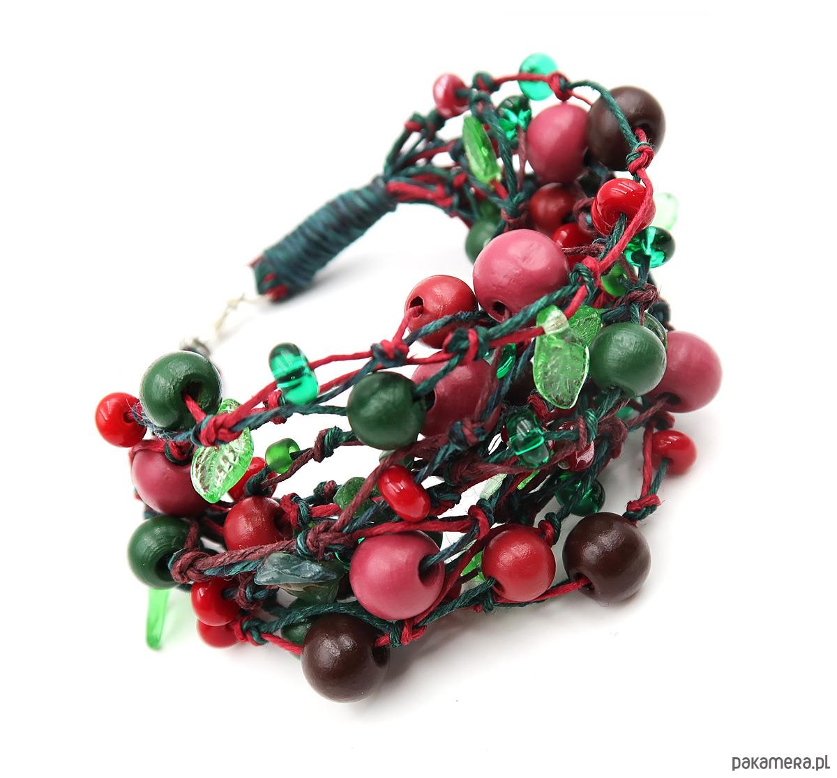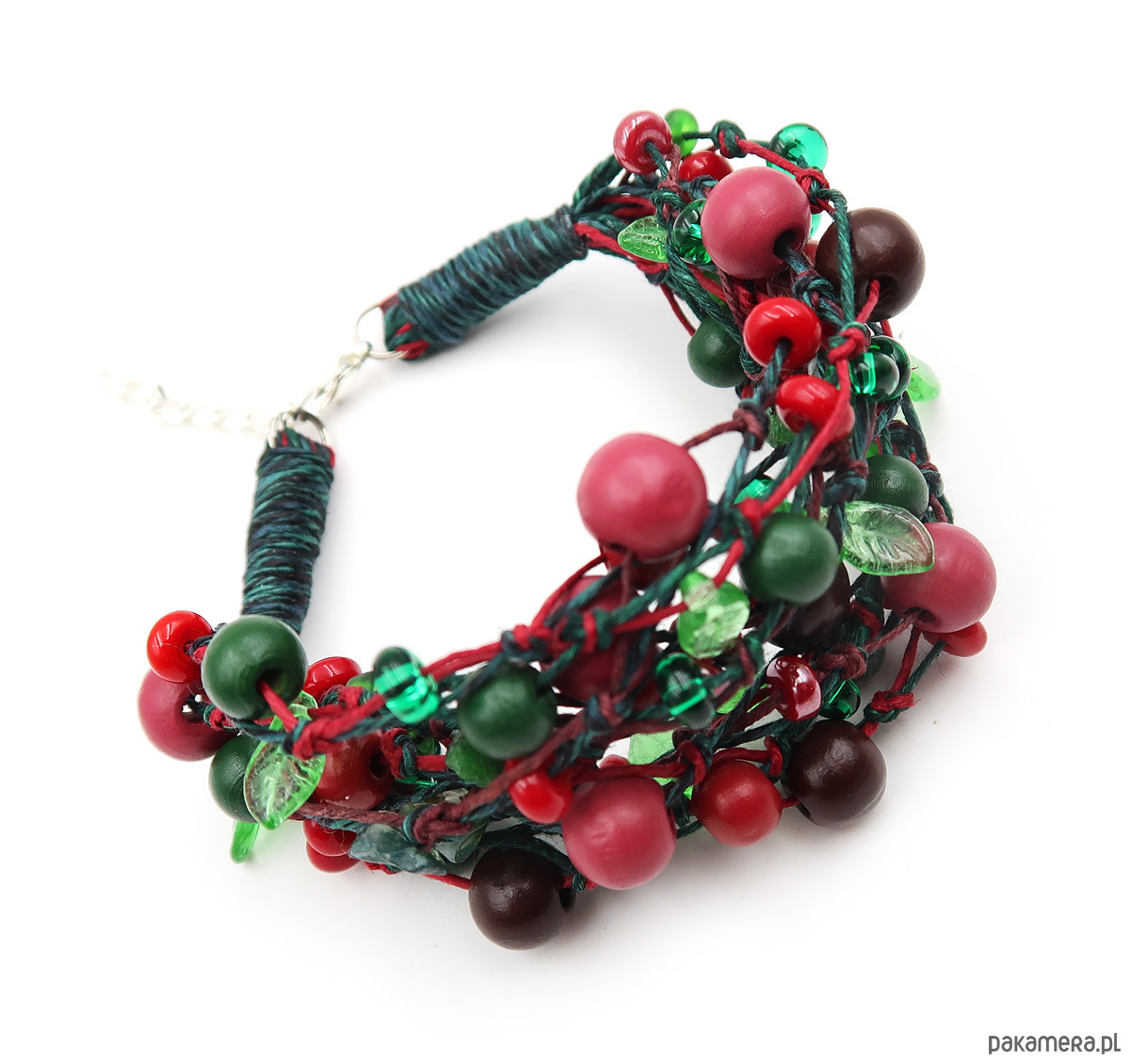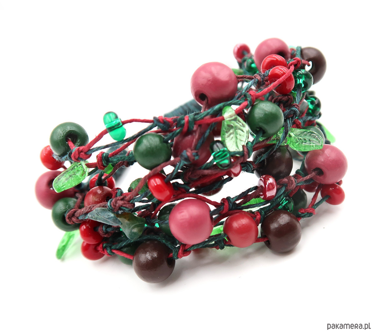 Autorska bransoleta wykonana na bazie przędzy lnianej w odcieniach bordo i butelkowej zieleni. Inspirowana leśnym runem oraz darami jagód i owoców leśnych.