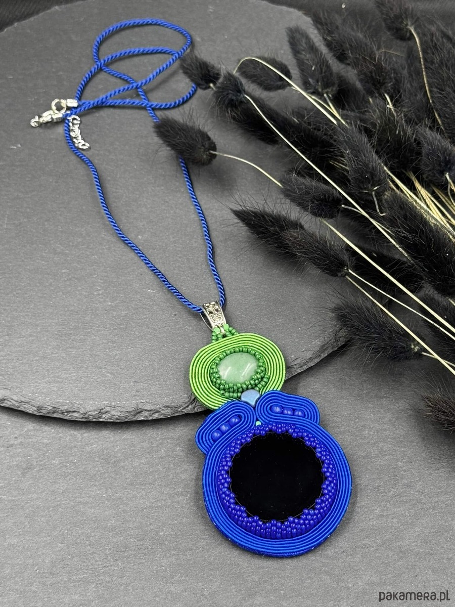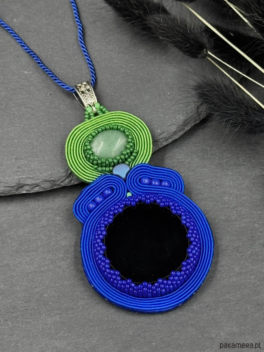 Wyrazisty wisior wykonany w technice haftu sutasz, łączący intensywny kobalt z soczystą zielenią. Kompozycja oparta jest na dwóch naturalnych kamieniach – głębokim, czarnym agacie oraz subtelnie mieniącym się awenturynie, który wprowadza do całości lekkość i naturalny charakter.