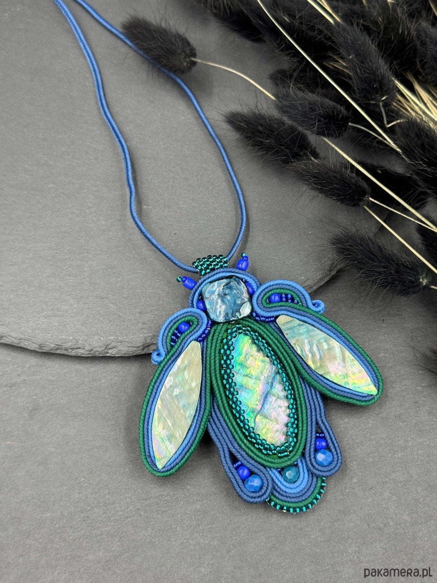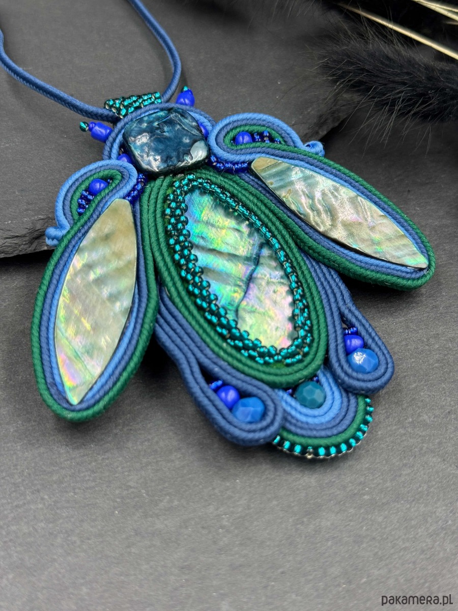 Efektowny, ręcznie wykonany wisior w technice haftu sutasz, utrzymany w głębokich odcieniach niebieskiego i zieleni. Centralnym elementem kompozycji jest masa perłowa o pięknym, opalizującym połysku, która mieni się w świetle subtelnymi refleksami.
