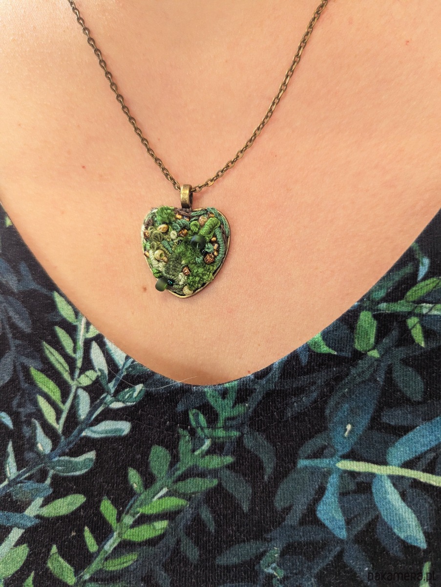 Ten wyjątkowy haftowany wisior w formie serca został ręcznie wyhaftowany na filcu i ozdobiony połyskującymi koralikami. W jego wnętrzu kryje się abstrakcyjna wizja lasu – pełna głębi, struktury i nastroju. Antyczna, brązowa baza dodaje mu charakteru i sprawia, że biżuteria zyskuje ponadczasowy, lekko vintage’owy wygląd.