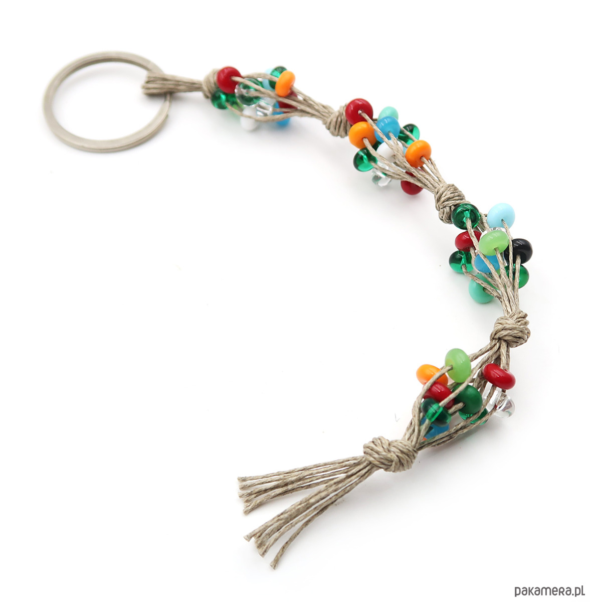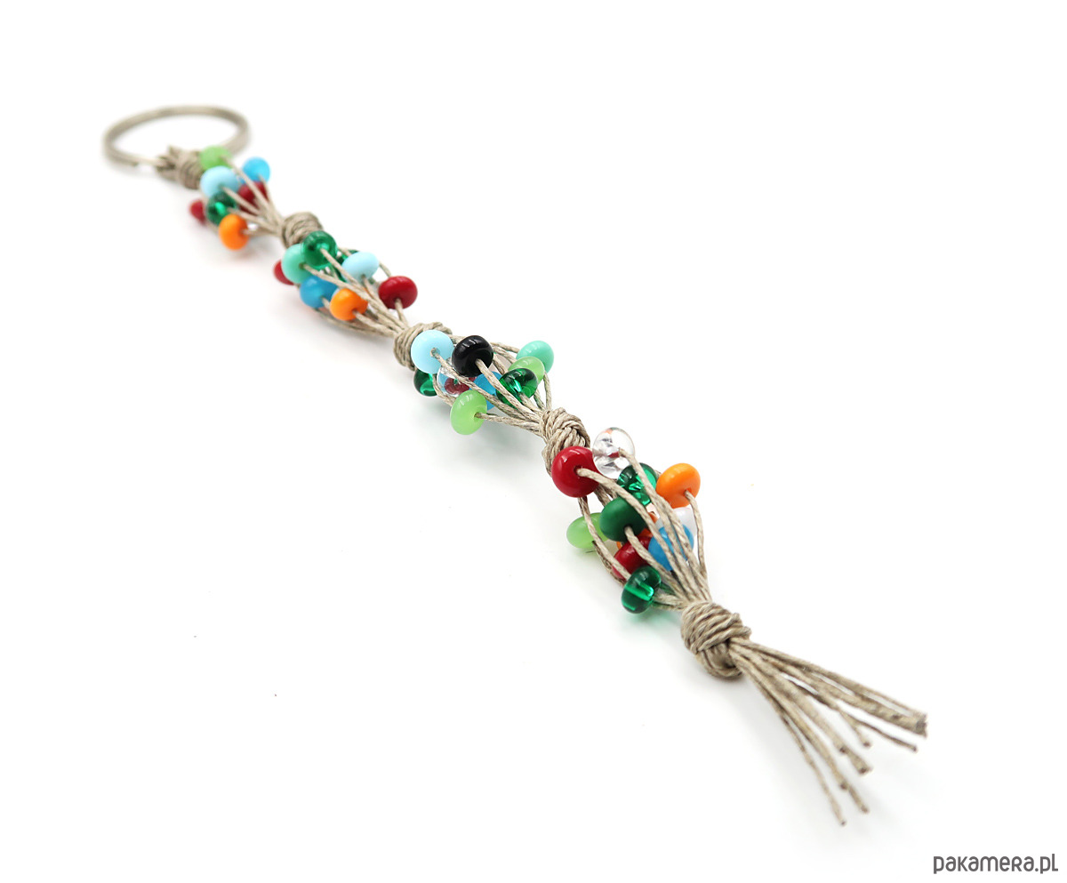 Optymistyczny brelok wykonany na bazie polskiej przędzy lnianej z wplecionymi szklanymi koralami czeskiej firmy Jablonex.