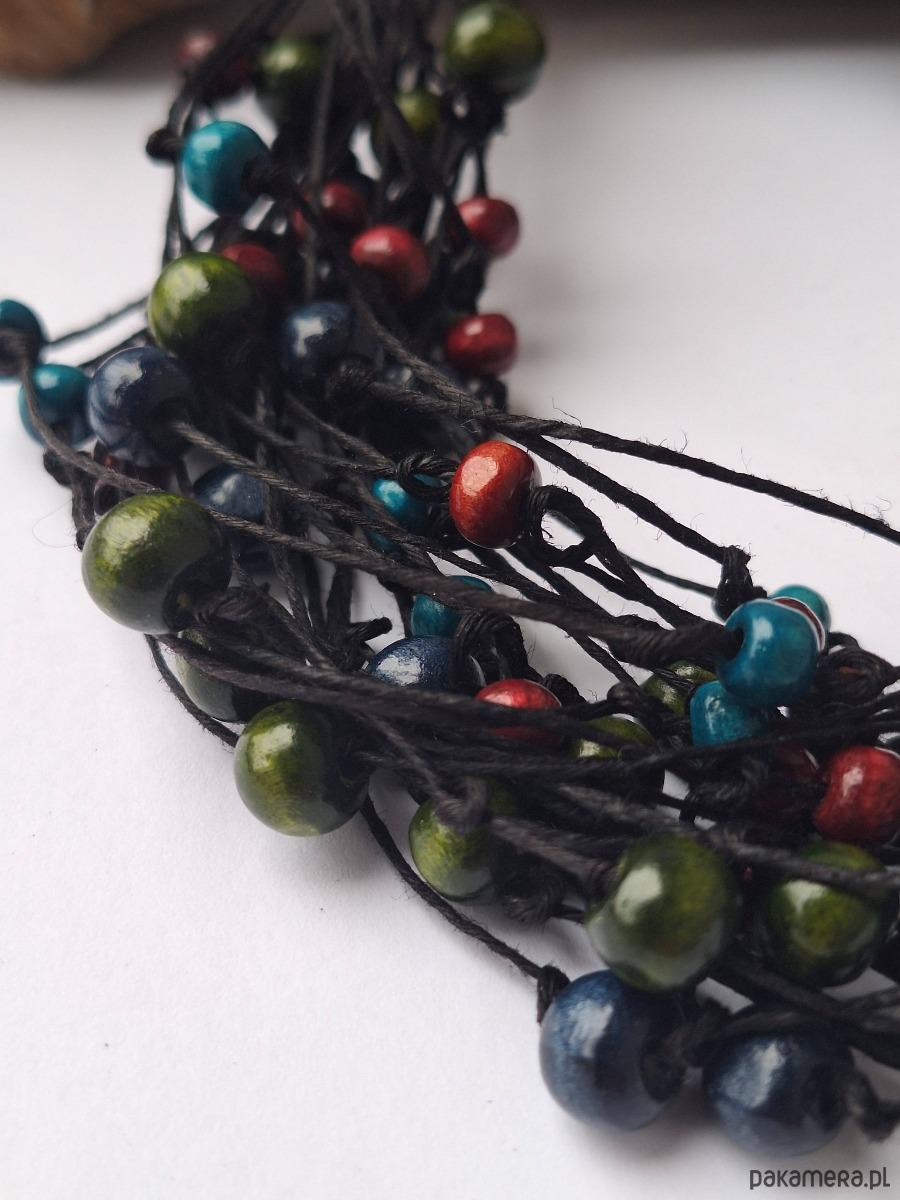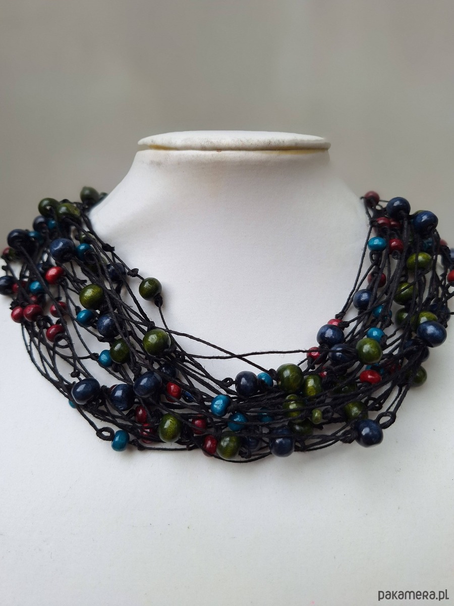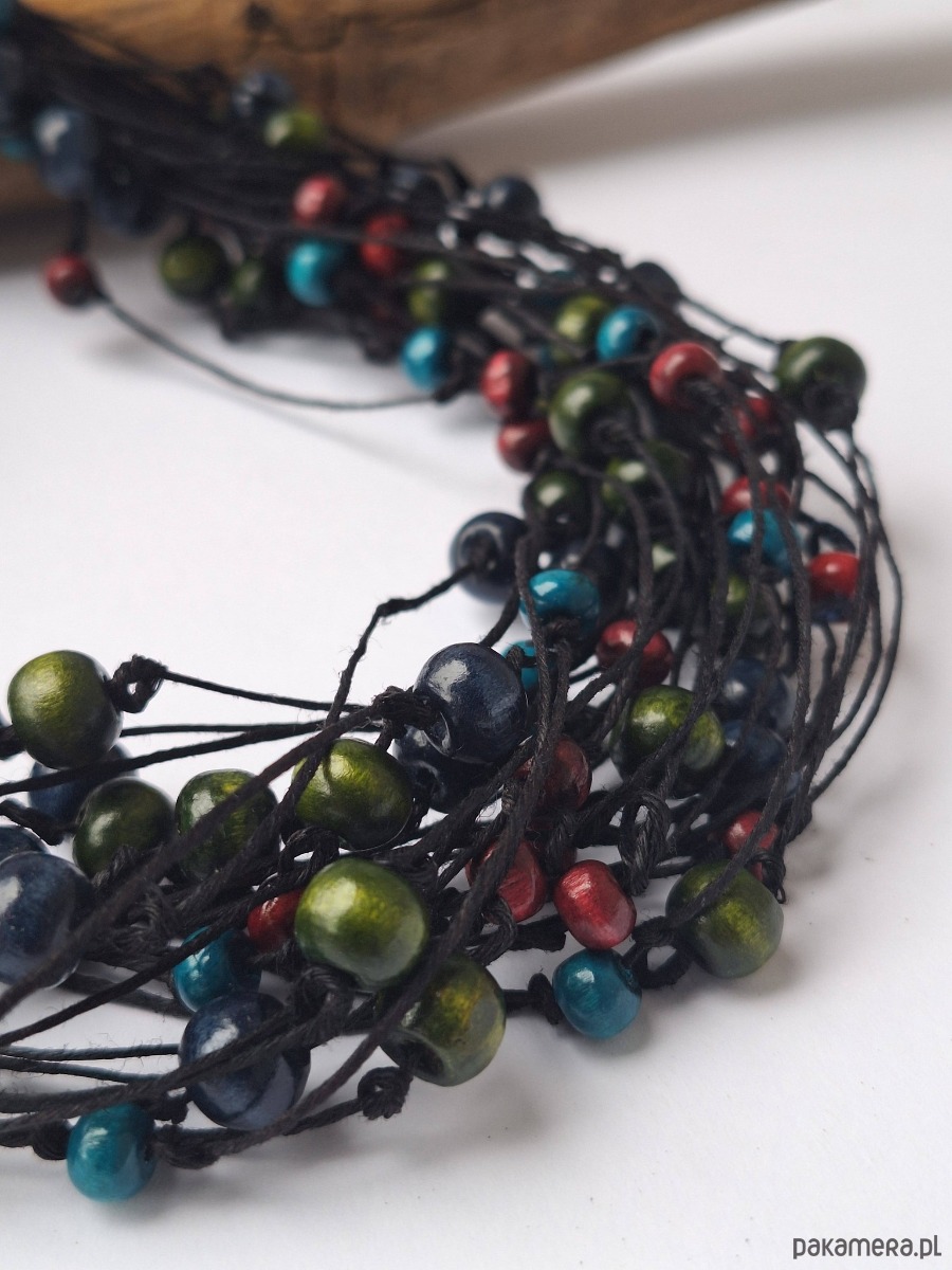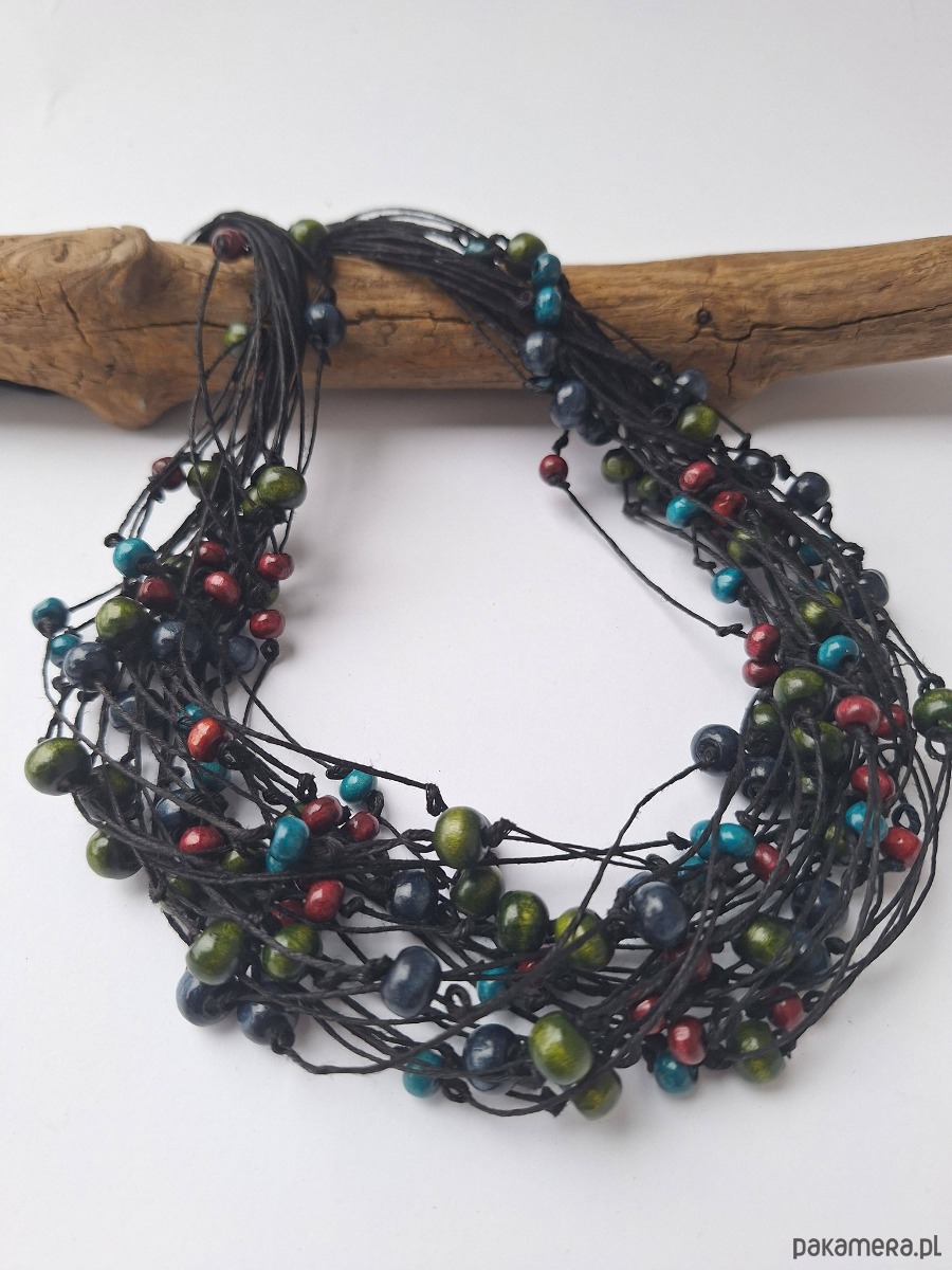 Naszyjnik z nici lnianych z drewnianymi kulkami.