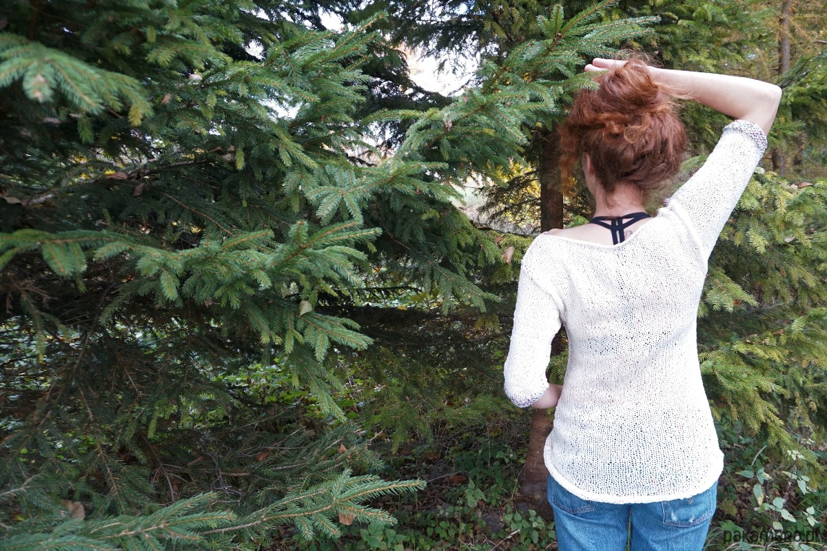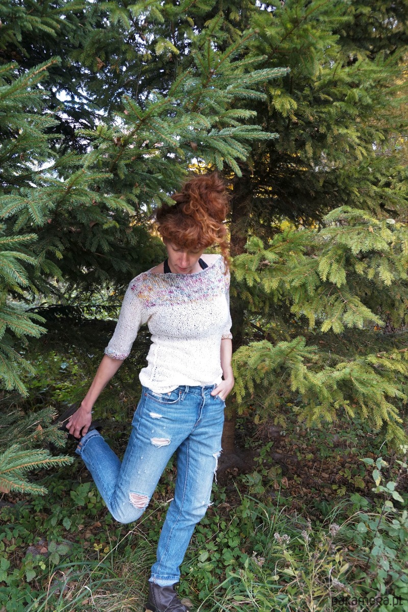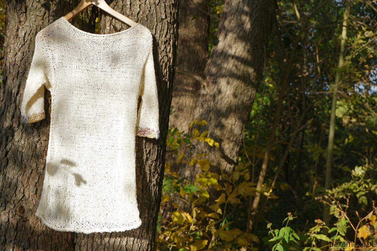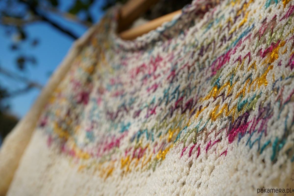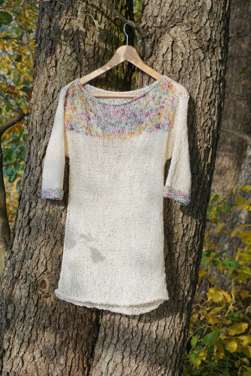 Lekki, jasny letni top wykonany ręcznie z miękkiej, przyjaznej dla skóry przędzy z bawełny i wiskozy. Bazowy kolor ecru został wzbogacony o wielobarwne, kalejdoskopowe wstawki z przodu oraz przy krawędziach rękawów, które nadają całości artystycznego, radosnego wyrazu.