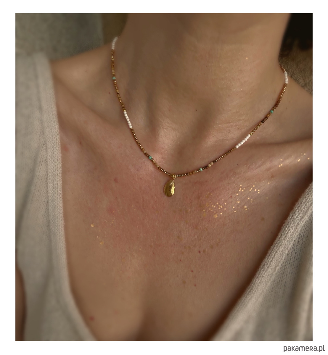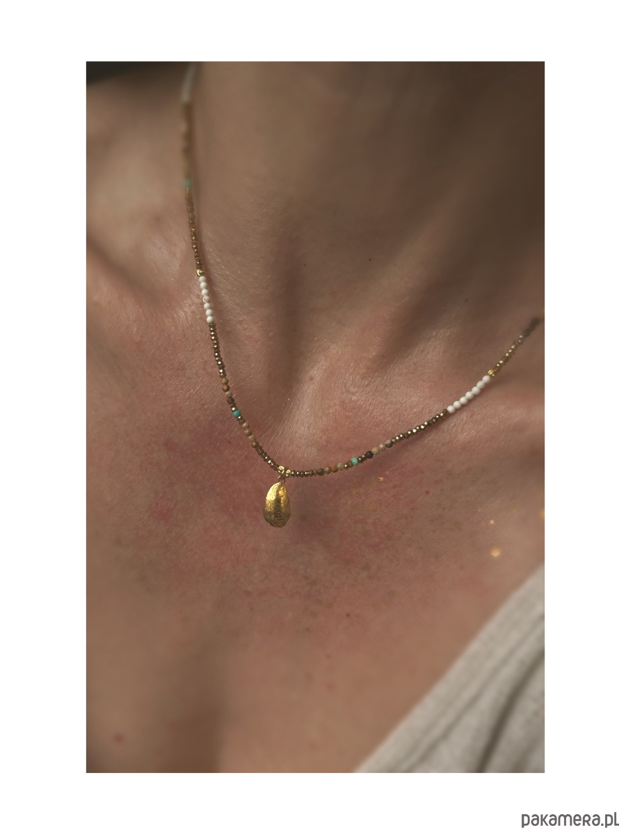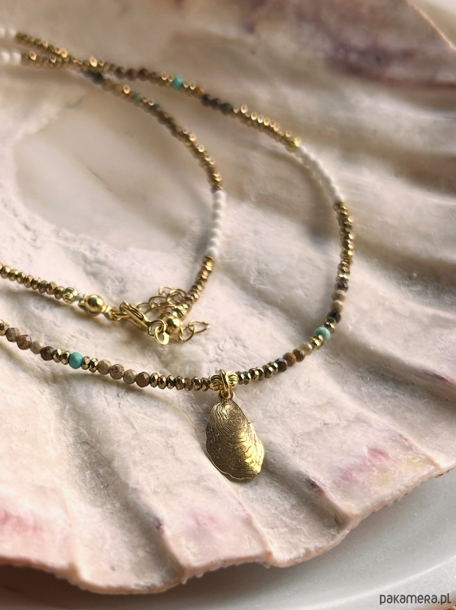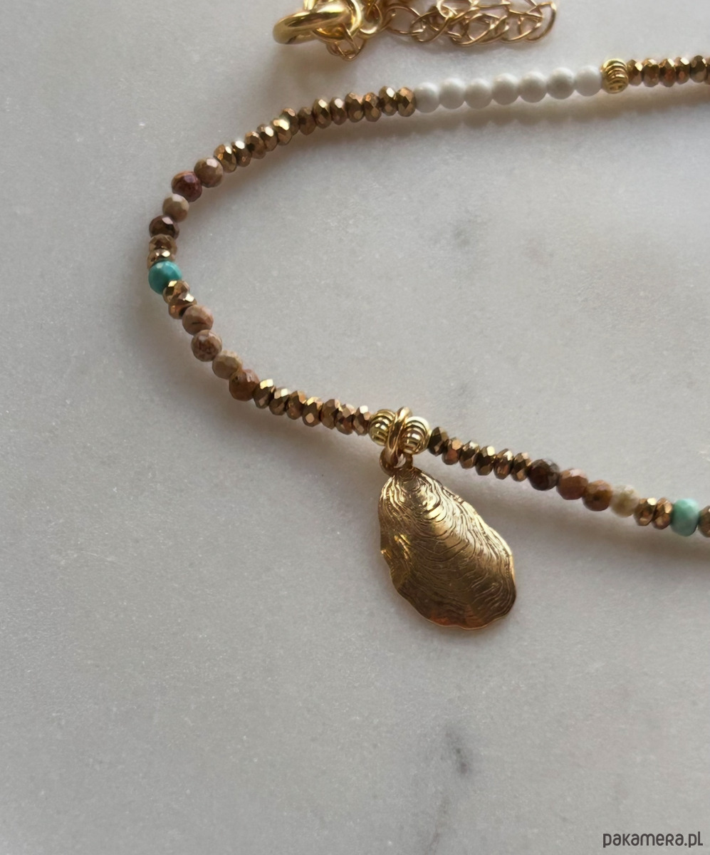 Piękno kamieni zostało subtelnie podkreślone złotymi hematytami, pozłacane dodatki. Symbol lata- muszelka. Naszyjnik - talizman szczęścia i życiowego optymizmu.