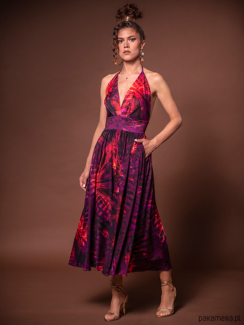 Sukienka, która będzie idealna na letnie spacery brzegiem morza jak i ważne uroczystości, wesela, imprezy. Zwiewny i lekki jersey z naszym autorskim deseniem HOT TROPICAL