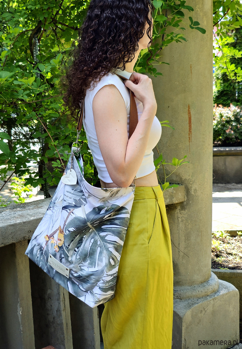 Worek z kolekcji wiosenno- letniej wykonana jest z wytrzymałej i wodoodpornej tkaniny w kwiaty i liście na białym tle.