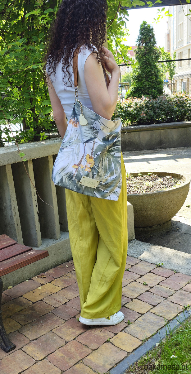 Worek z kolekcji wiosenno- letniej wykonana jest z wytrzymałej i wodoodpornej tkaniny w kwiaty i liście na białym tle.