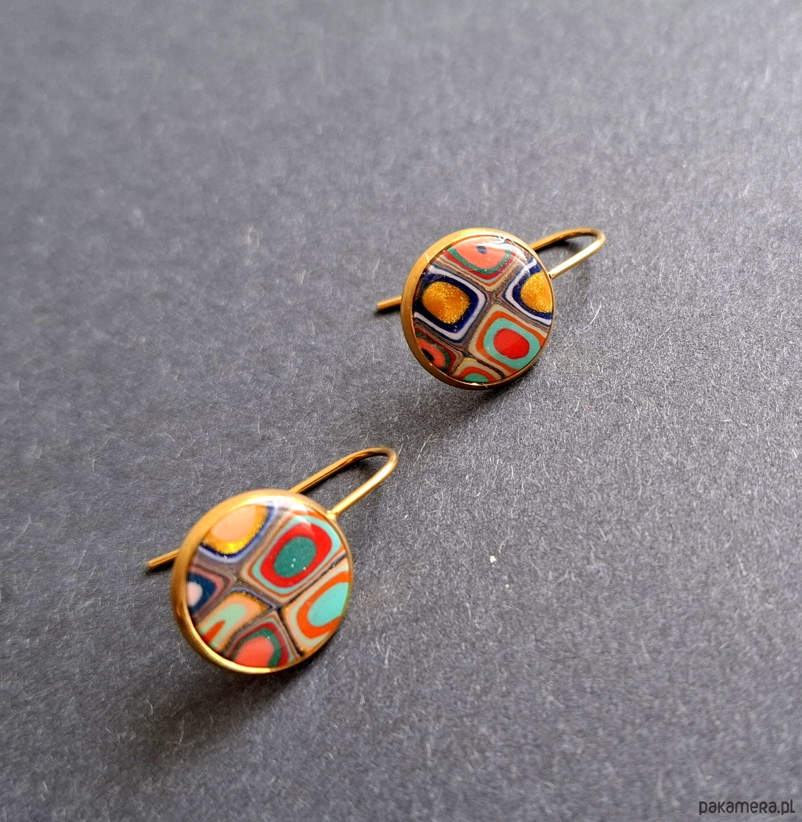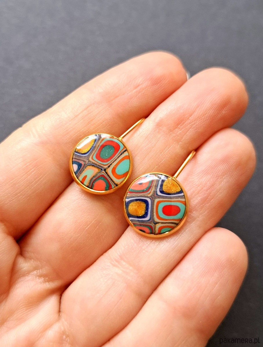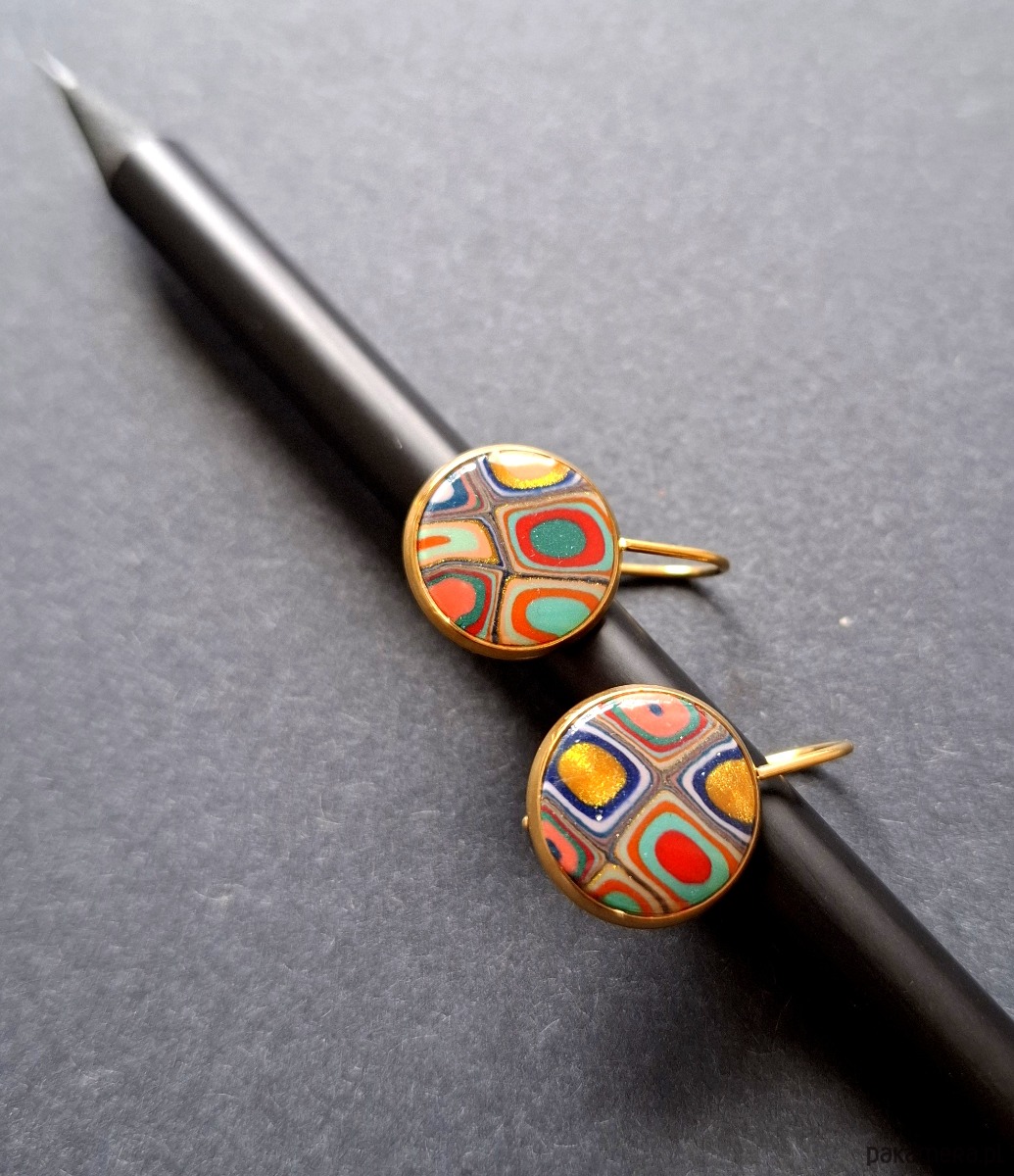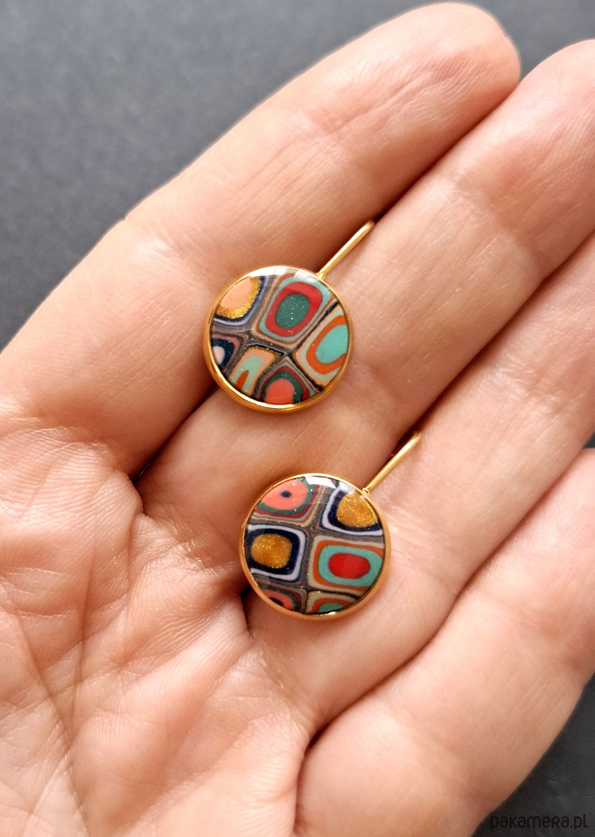 Ozdobne kolczyki wiszące wykonane z wysokiej jakości glinki polimerowej. Kolczyki o bazie pozłacanej, nieuczulającej. Wymiary - długość całkowita: 2,1 cm; średnica motywu: 1,4 cm.