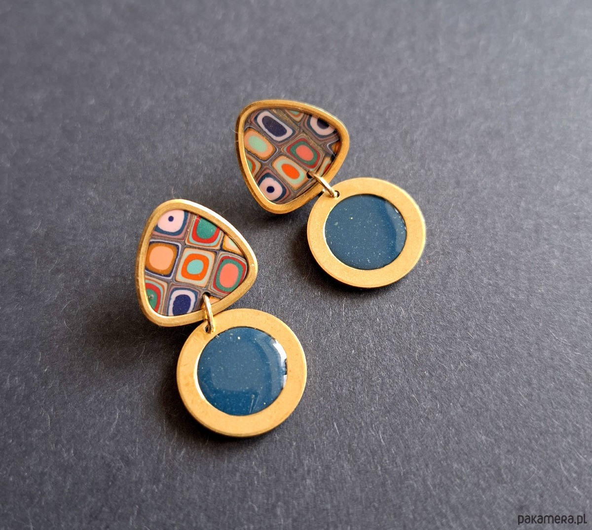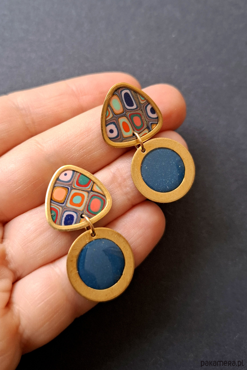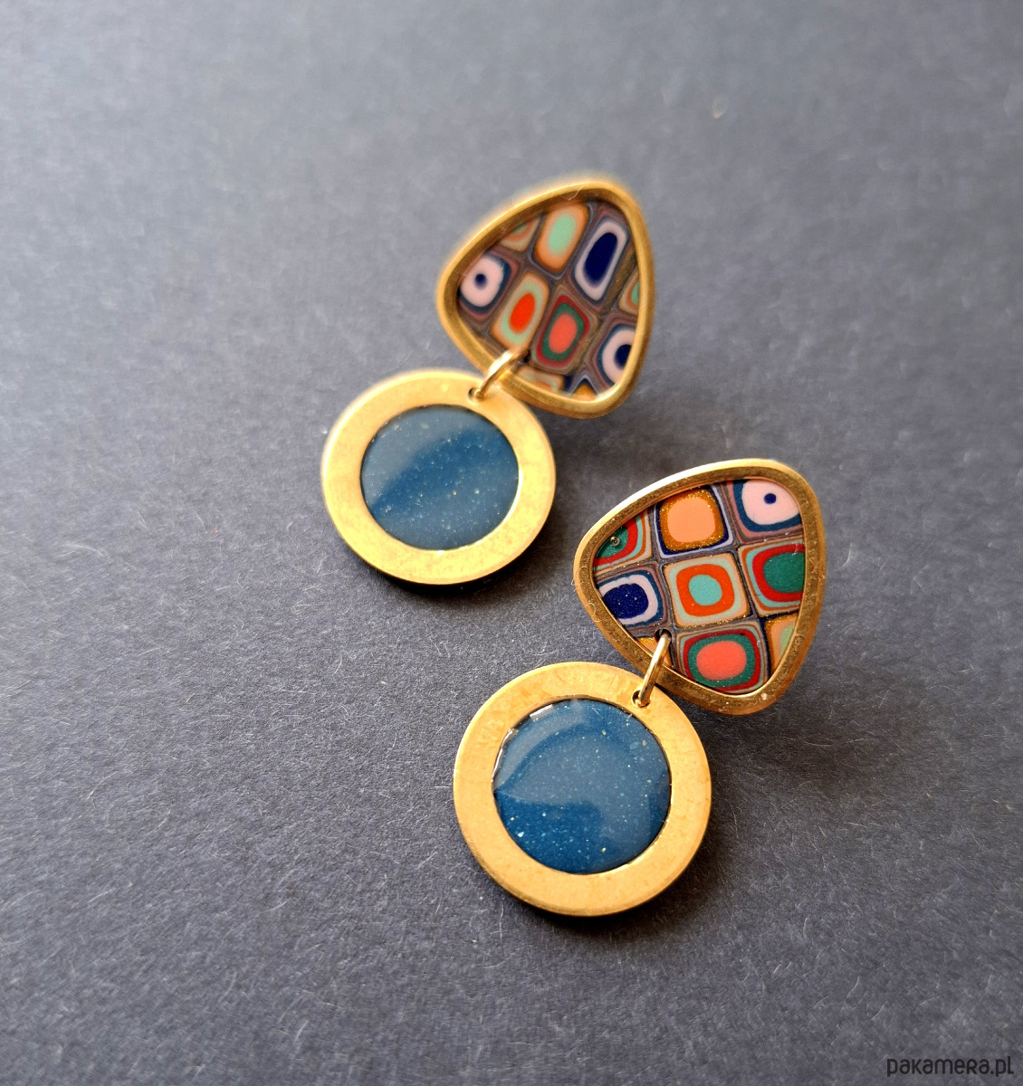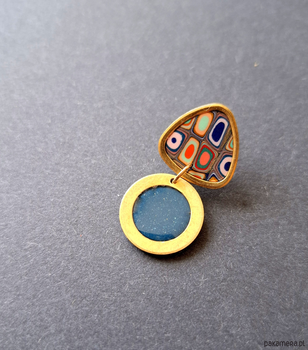 Ozdobne sztyfty wykonane z wysokiej jakości glinki polimerowej w połączeniu z ozdobnymi metalowymi elementami w złotym kolorze. Kolczyki jednostronne ze sztyftami pozłacanymi i nieuczulającymi z zapięciem na klasyczne baranki.