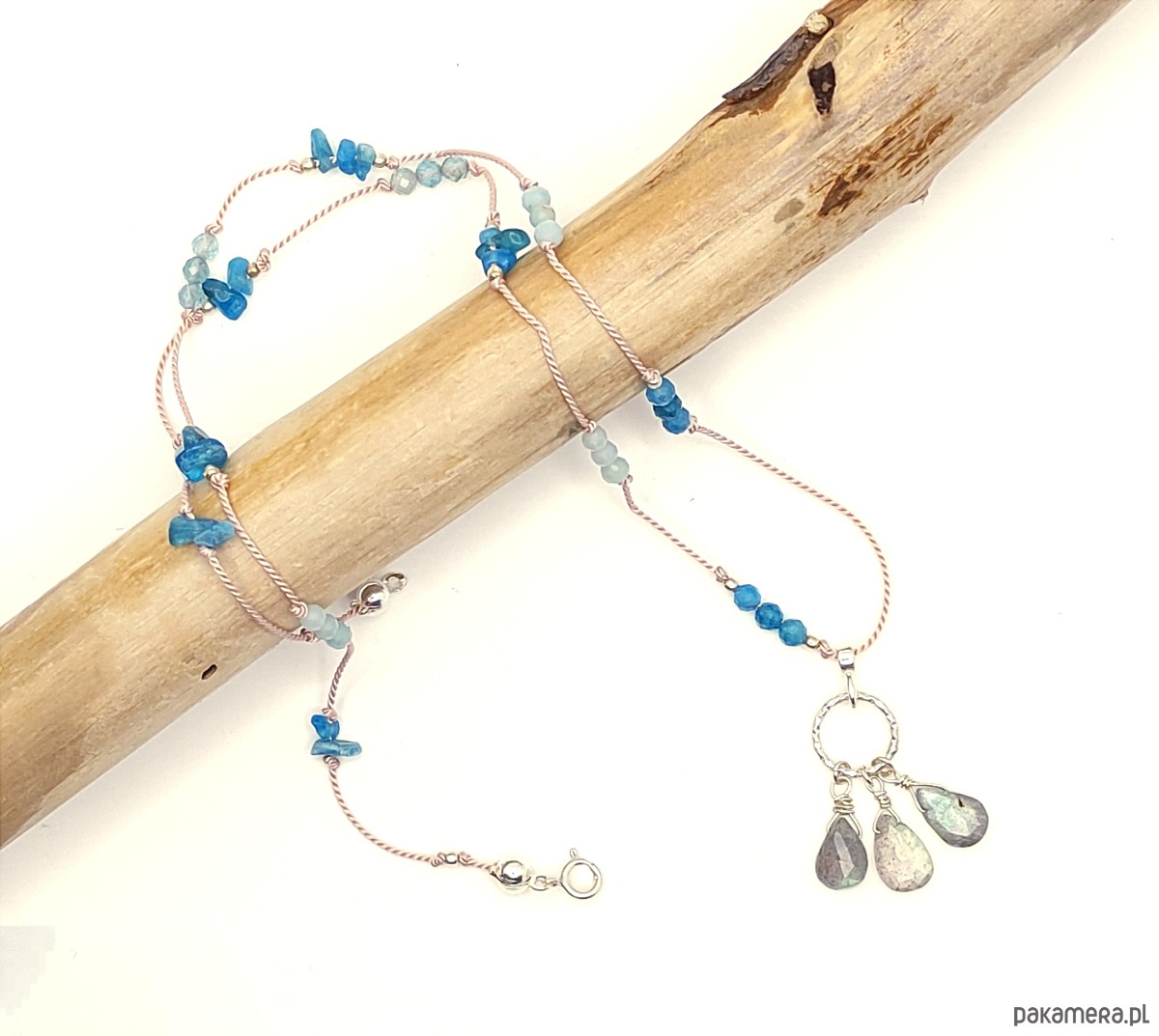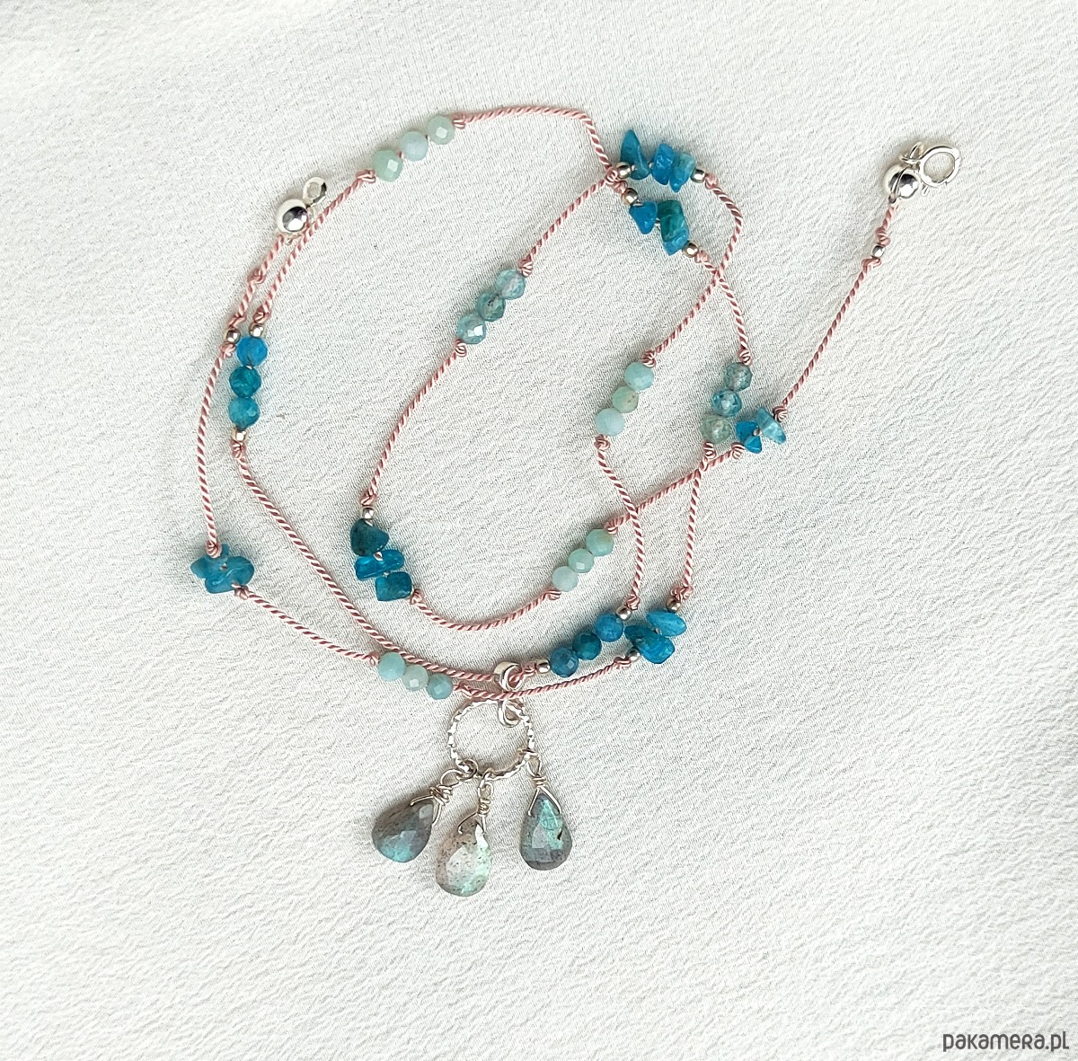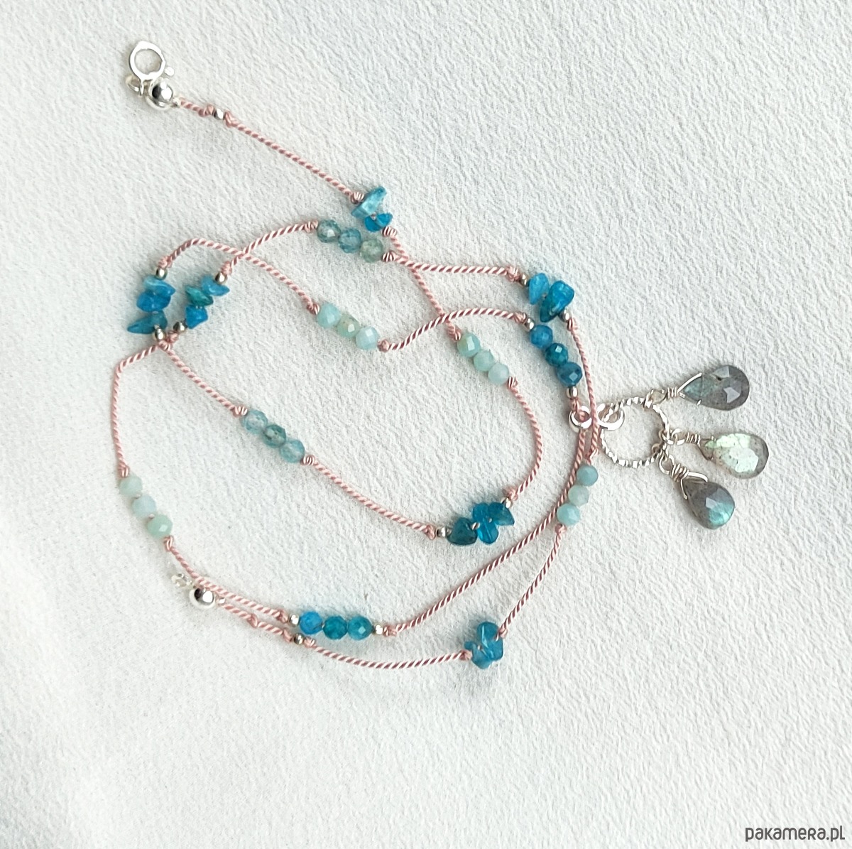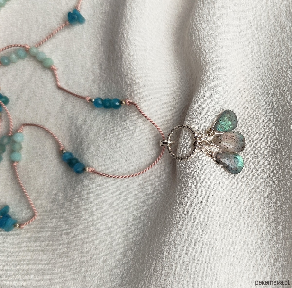 Leciutki, wakacyjny naszyjnik z przemyślanym układem kamieni apatytu (kuleczki i nieregularne bryłki) oraz amazonitu. Zwieńczony uroczą zawieszką z kółeczkiem i luźno wiszącymi brioletkami labradorytu. Labradoryt w pięknym kolorze srebrzacego się błękitu i turkusu. Całość na bladoróżowej, mocnej nici.