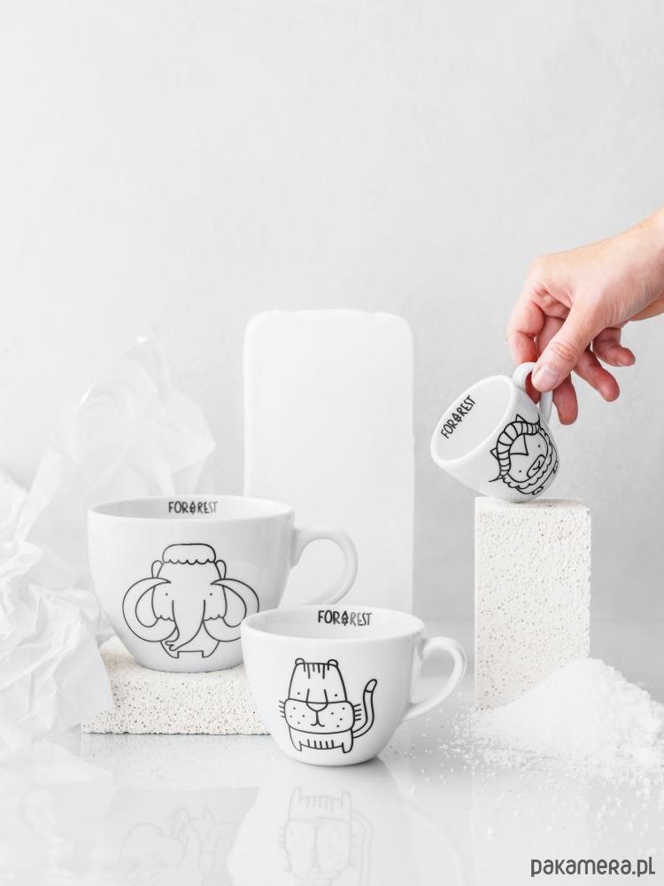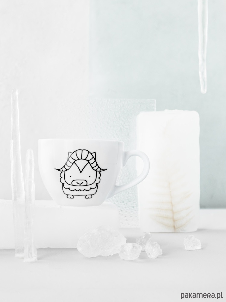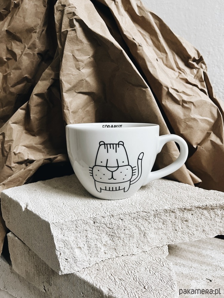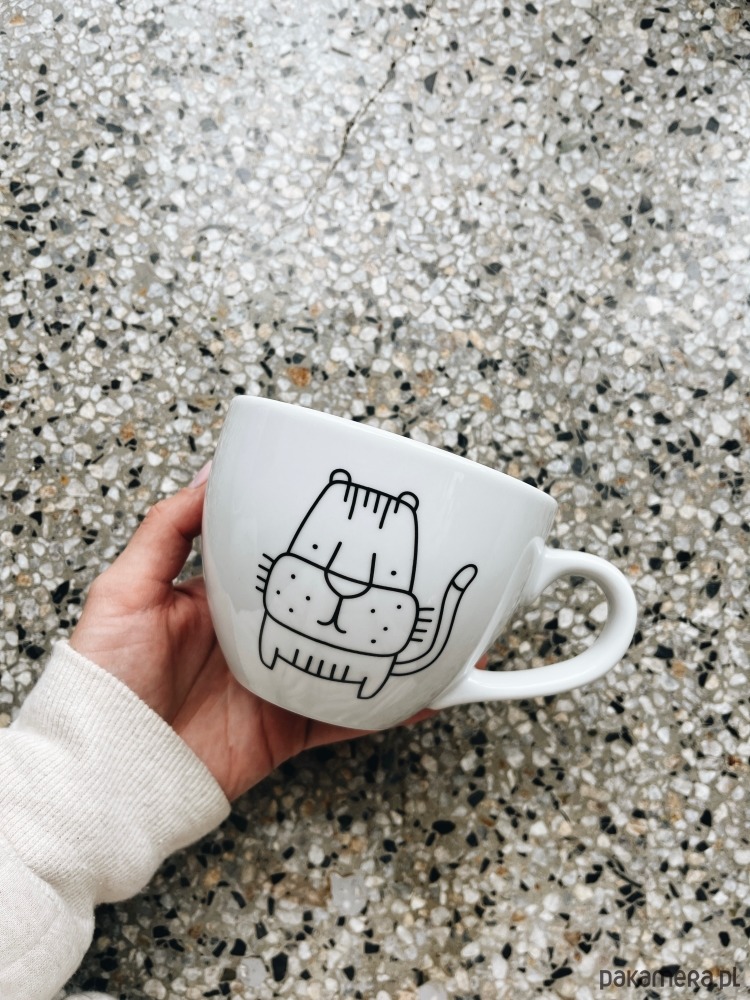 Biały kubek na kawę i herbatę dekorowany ręcznie według autorskiego projektu.