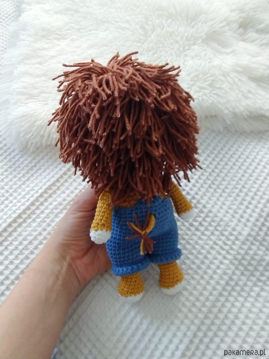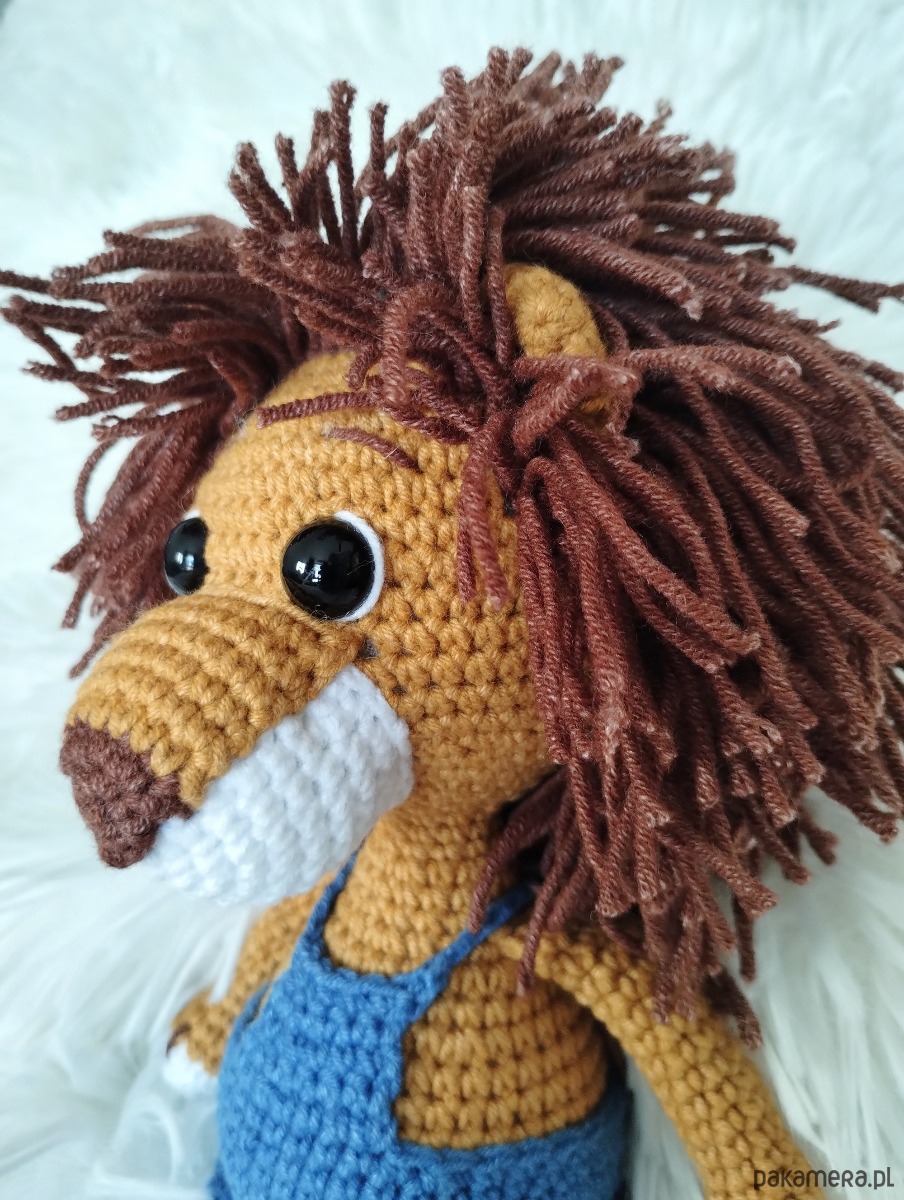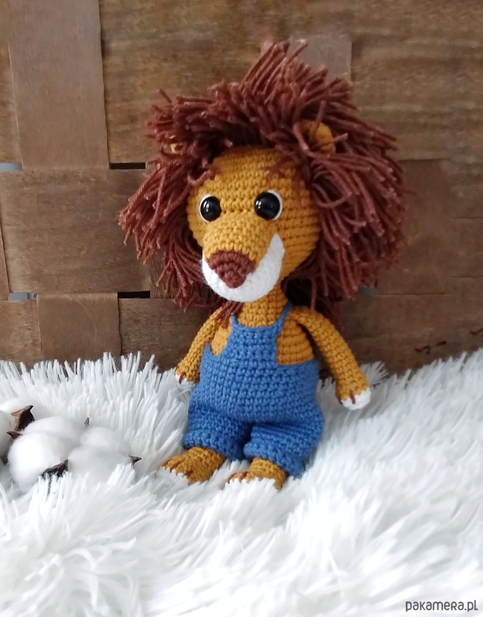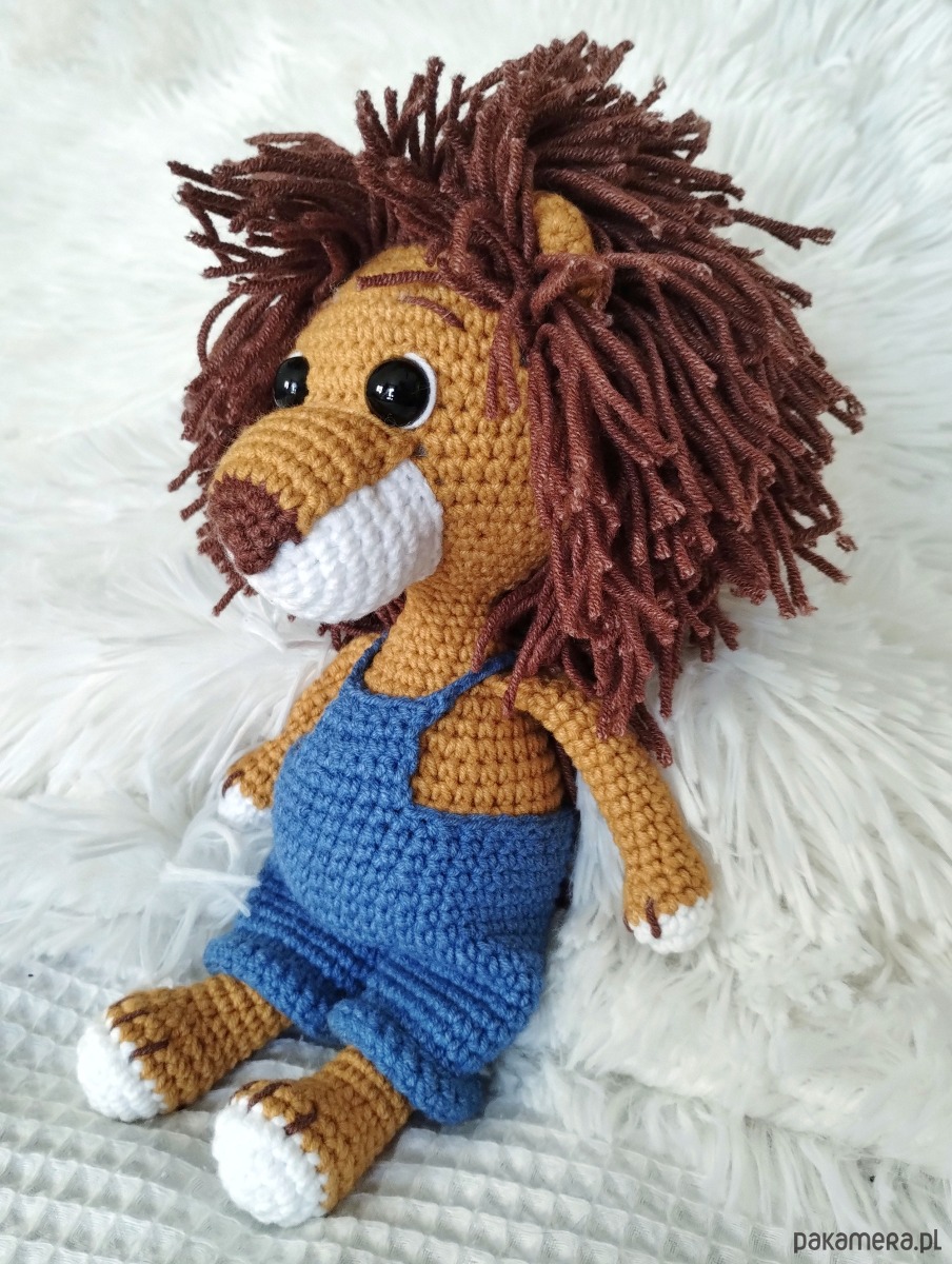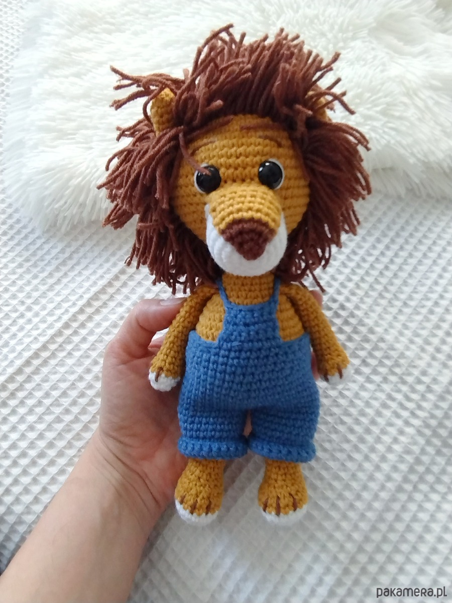 Szydełkowy lew ze zdejmowanymi spodenkami to urocza zabawka dla każdego malucha.