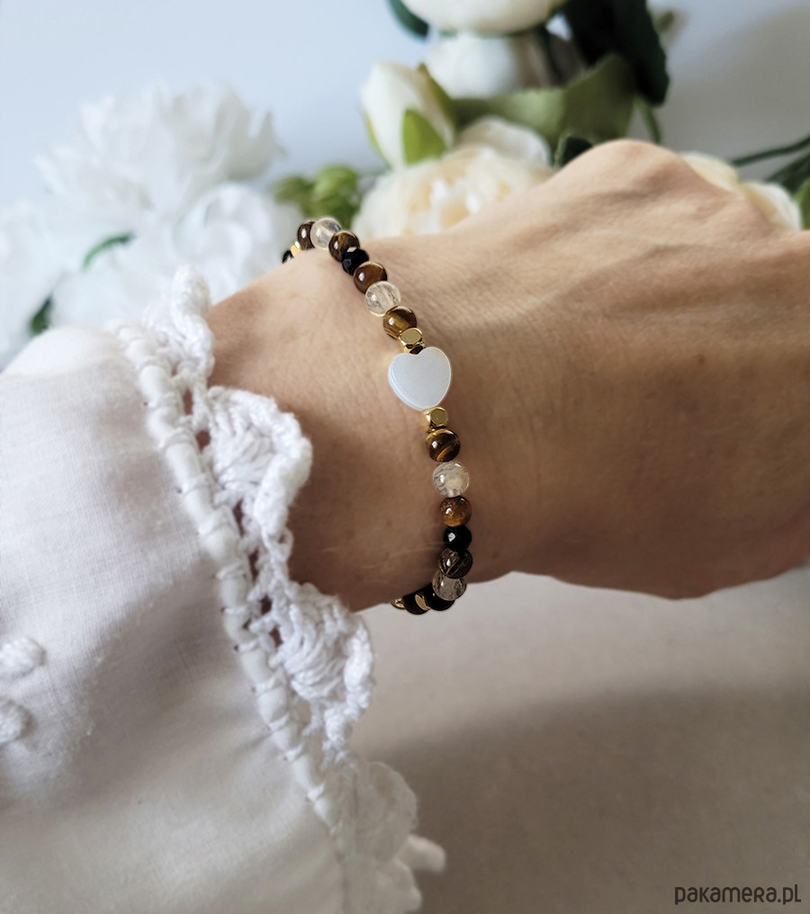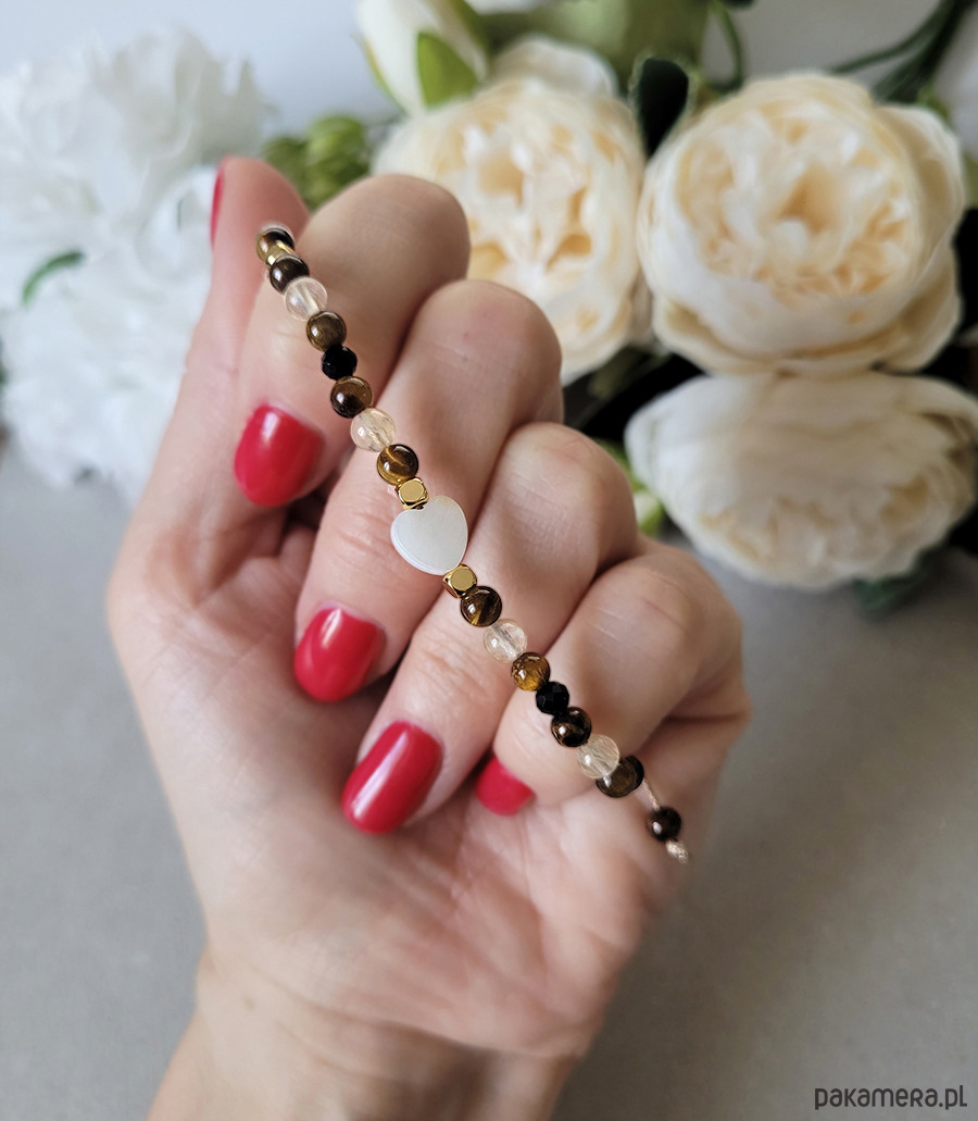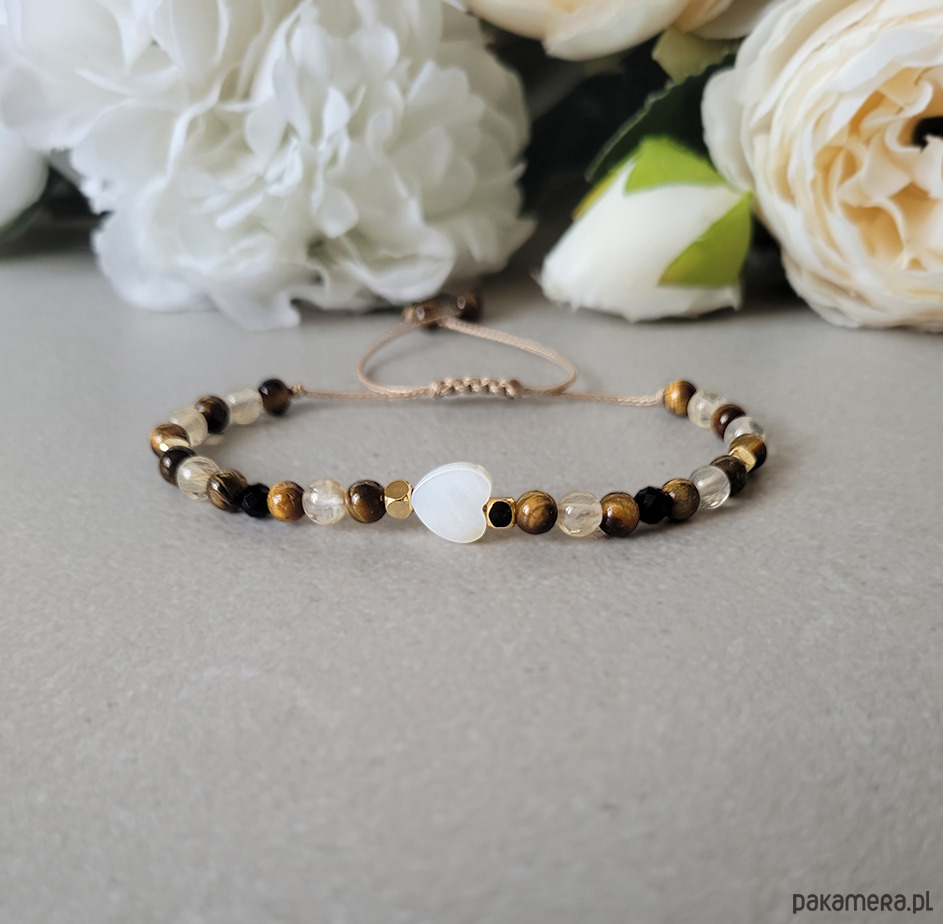 Bransoletka zrobiona z kamieni naturalnych: Masy perłowej, Tygrysiego oka, Cytrynu z dodatkiem Turmalinu głównie przeznaczona dla zodiakalnego Lwa.