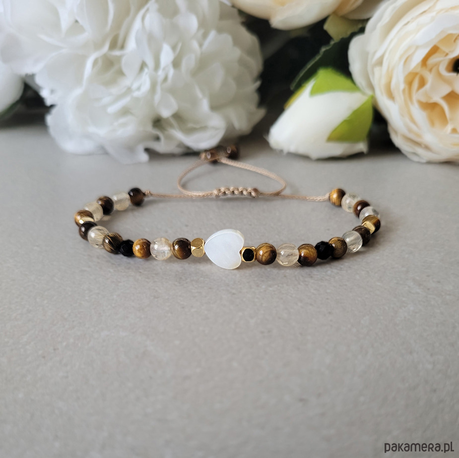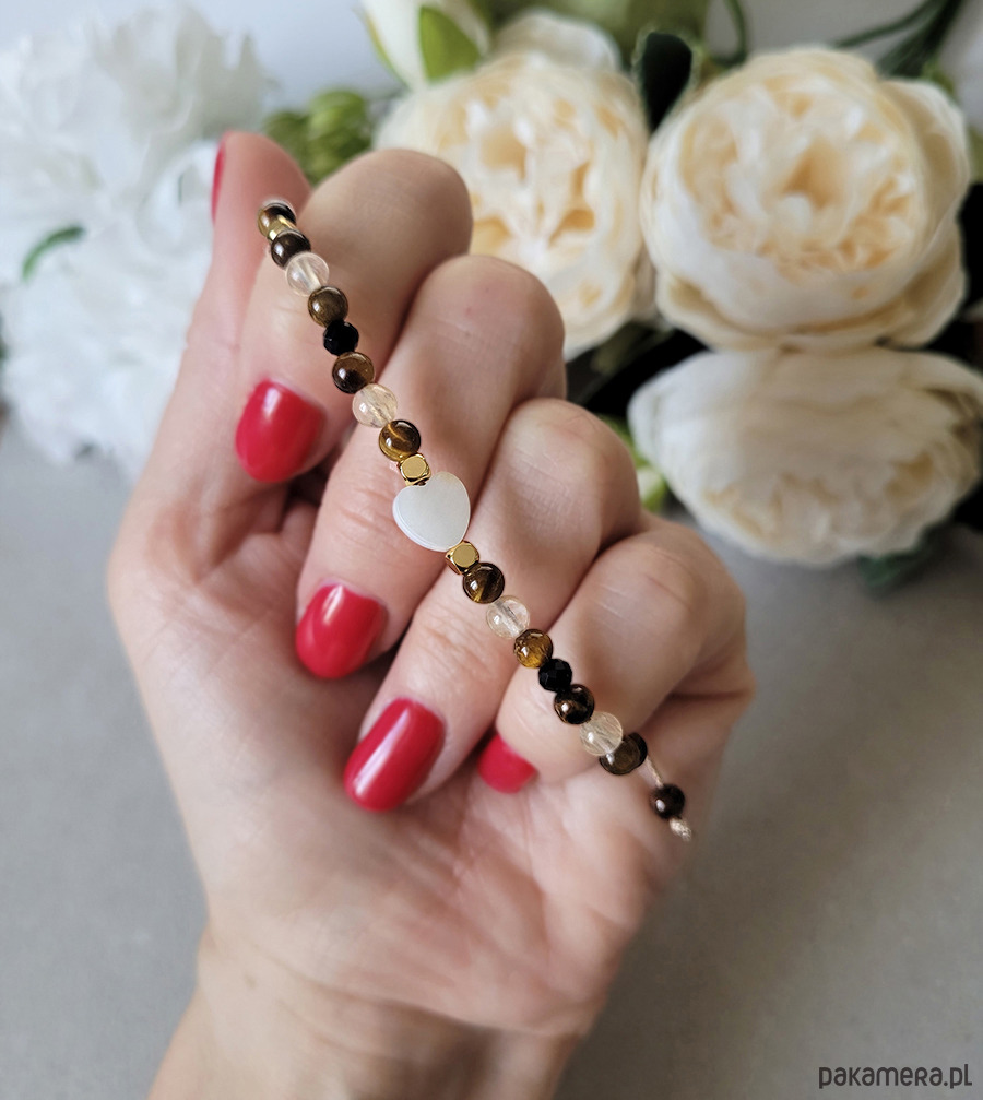 Bransoletka zrobiona z kamieni naturalnych: Masy perłowej, Tygrysiego oka, Cytrynu z dodatkiem Turmalinu głównie przeznaczona dla zodiakalnego Lwa.