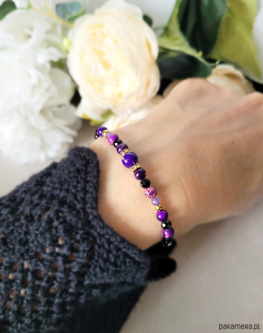 Bransoletka zrobiona z kamieni o śr. ok. 4mm oraz 6mm.