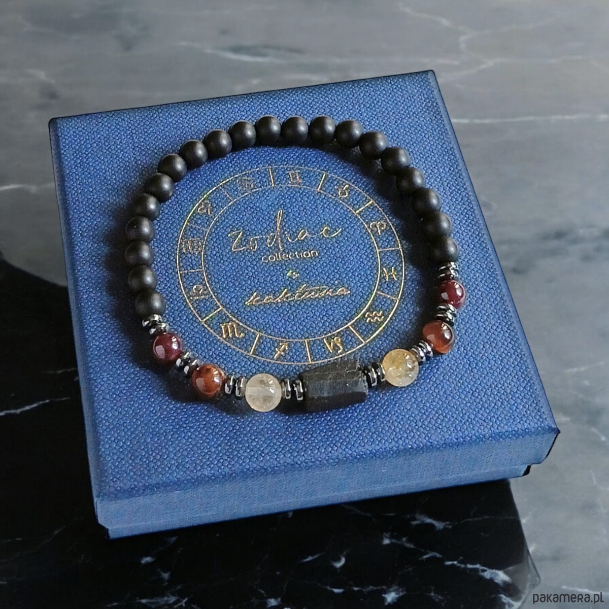 TUTAJ: Bransoletka na solidnej gumce jubilerskiej, wykonana z: surowej bryłki czarnego turmalinu, matowego onyksu 6mm, granatu 6mm, cytrynu 6,5mm, tygrysiego oka 6mm, przekładek z hematytu.
