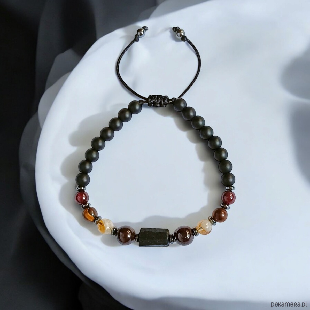 TUTAJ: Bransoletka na solidnym sznurku nylonowym, wykonana z: surowej bryłki czarnego turmalinu, matowego onyksu, granatu (8,5 i 6mm), cytrynu 6,5mm, tygrysiego oka 6mm, przekładek z hematytu.