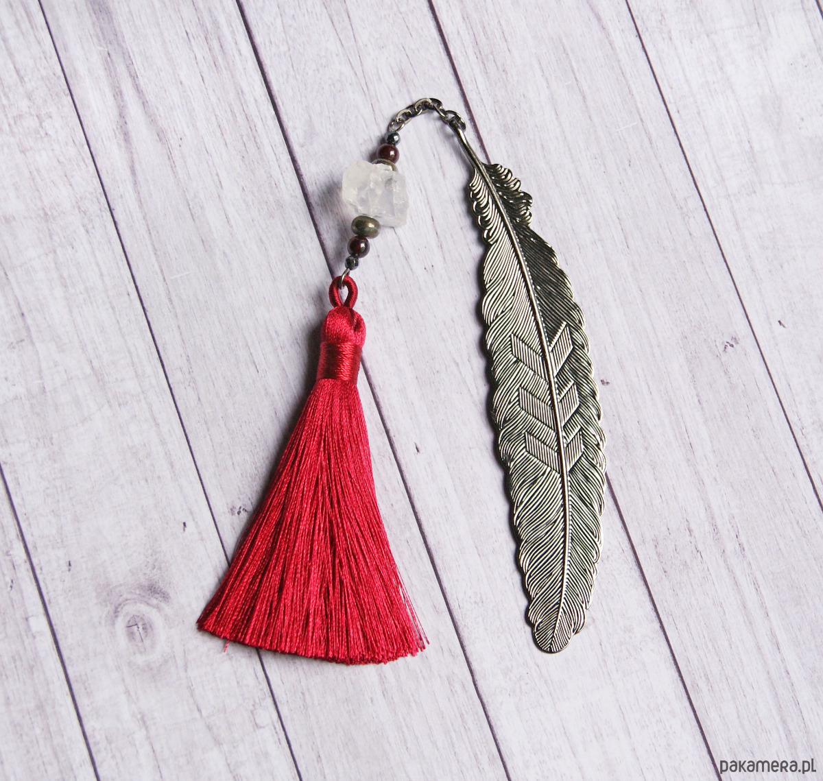 oto jedna z nich: SUROWA BRYŁKA KRYSZTAŁU GÓRSKIEGO, granat, piryt, hematyt, okazały chwost, czerniony metal . wszystkie poszczególne elementy są ruchome, więc zakładka będzie się ładnie układała. długość samej zakładki (pióra) : ok.12cm. .. dł. całego elementu wiszącego: ok.16cm.
