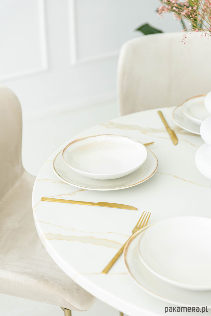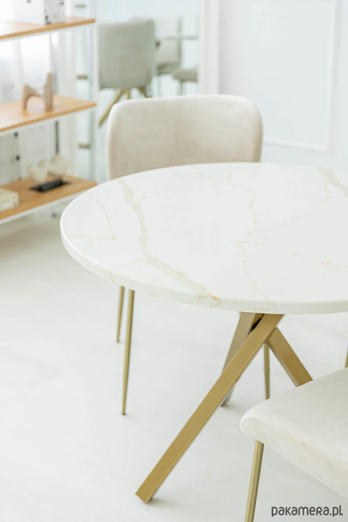 Stół jadalniany to doskonały element wyposażenia, który jest w stanie zagwarantować nie tylko wygodę podczas posiłku, ale również dodaje uroku do każdego pomieszczenia. Model ten wykonany jest z wysokiej jakości materiałów, a dzięki temu, wyróżnia się wytrzymałością i odpornością na uszkodzenia. Blat stołu został wykonany ze spieku kwarcowego calacatta gold, który jest odporny na zarysowania i plamy.