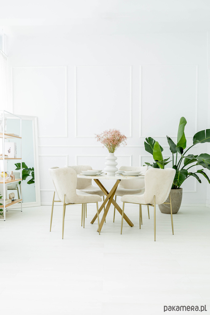 Stół dodaje niepowtarzalnego uroku do każdego pomieszczenia i sprawia, że jadalnia wręcz zachęca do przyjścia do domu i spożywania posiłku w gronie najbliższych. Stół jadalniany składa się również ze stelaża malowanego proszkowo na złoto, dzięki czemu możesz mieć pewność, że jego kolor z pewnością nie zmieni się, nawet po długim okresie użytkowania.