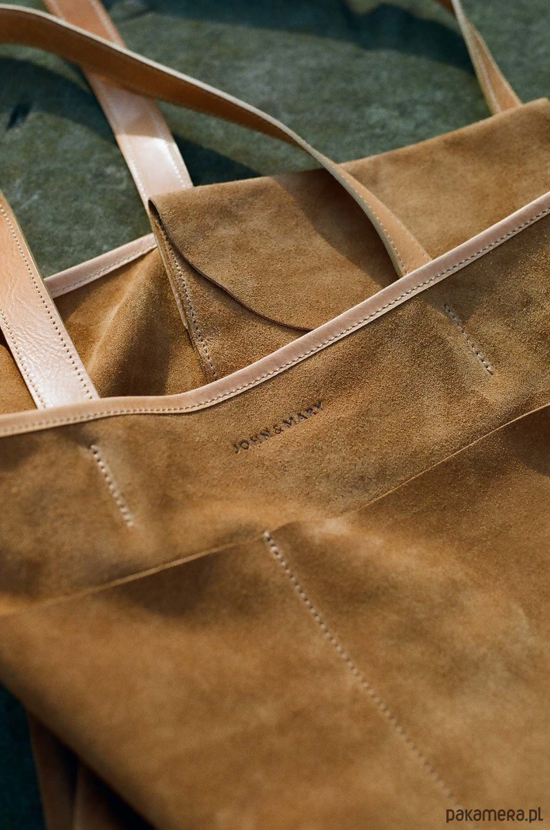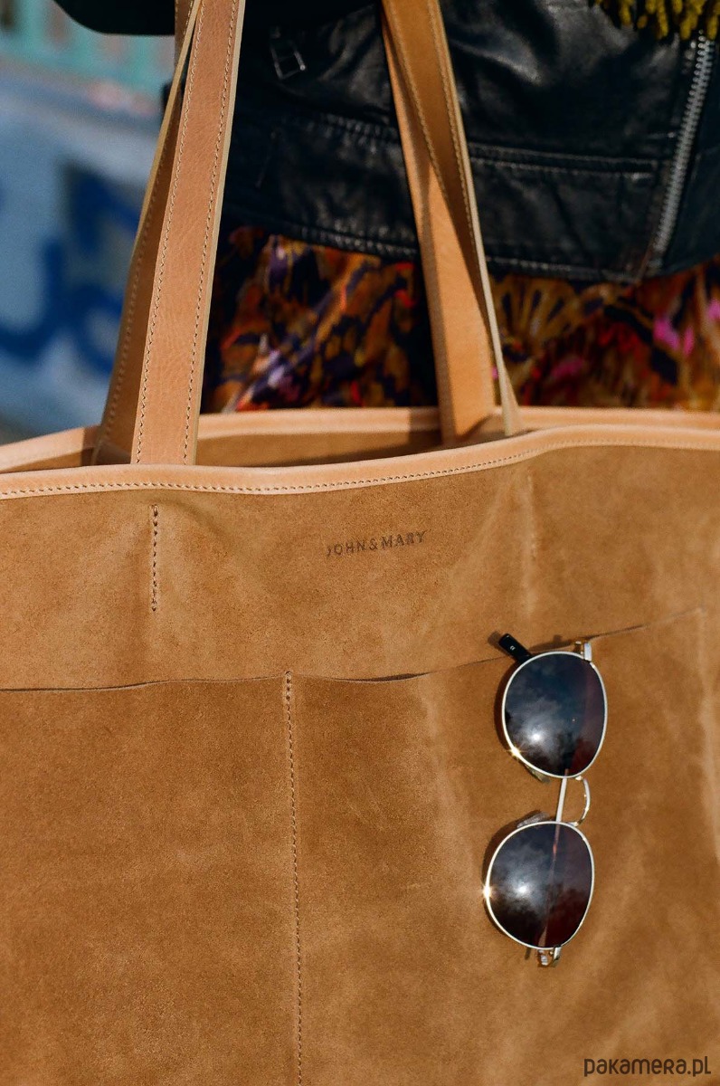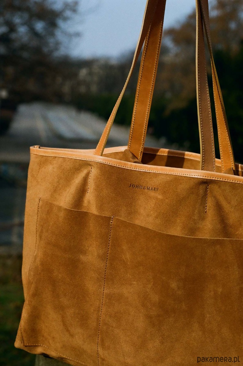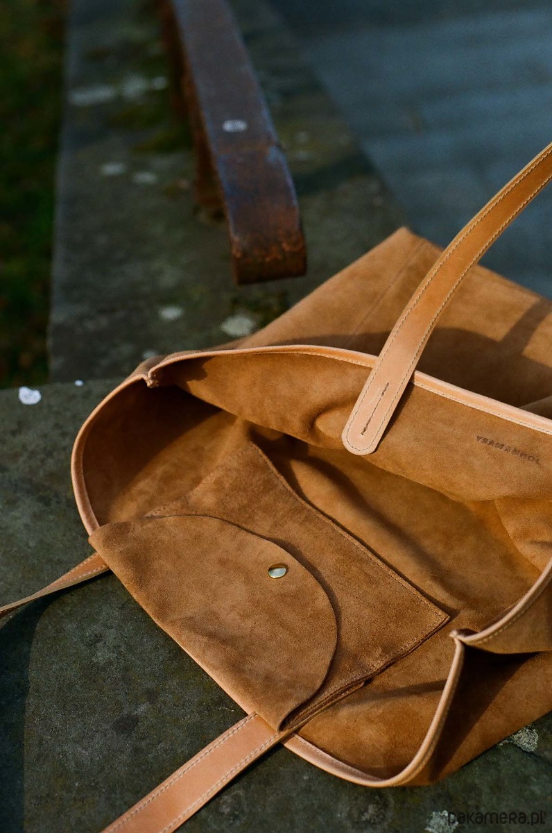 Uszy Lezamy są wykonane z podwójnej, licowej skóry w kolorze piaskowym i są doszyte do torby. Dno torby jest usztywnione drugą warstwą zamszu, dzięki czemu torba jest bardziej wytrzymała. Zamsz, z którego uszyto torbę, jest lejący i miły w dotyku, a sama torba swobodnie układa się na ramieniu, nie ograniczając ruchów.