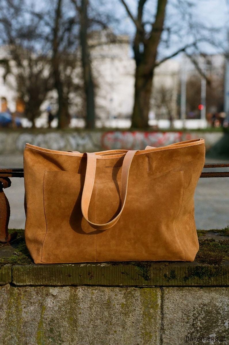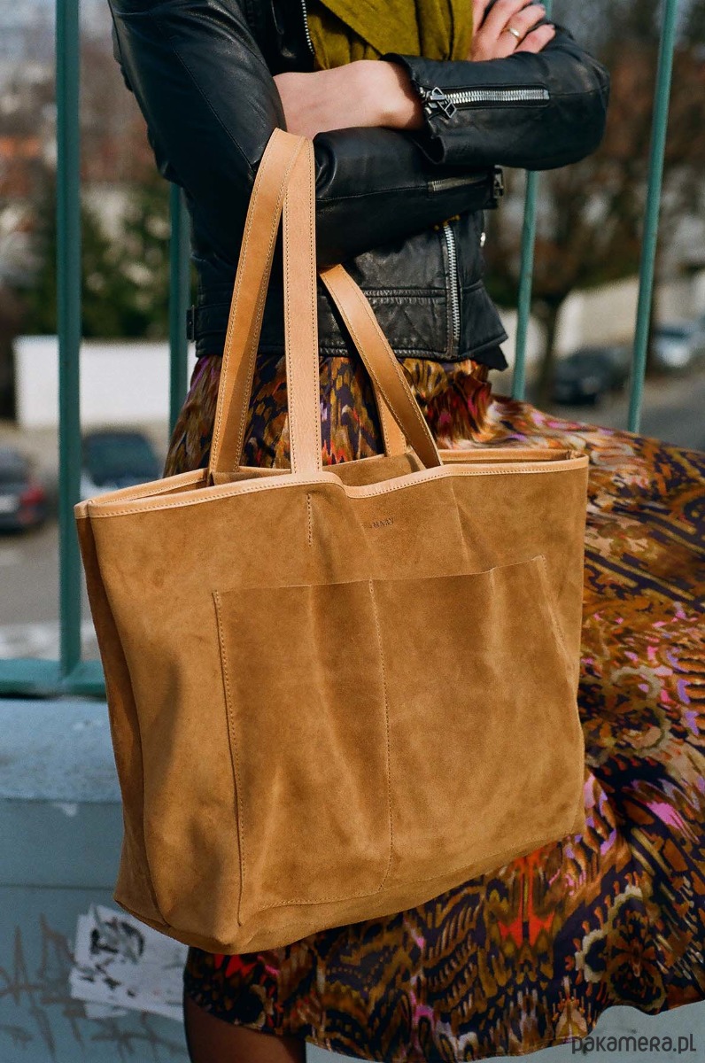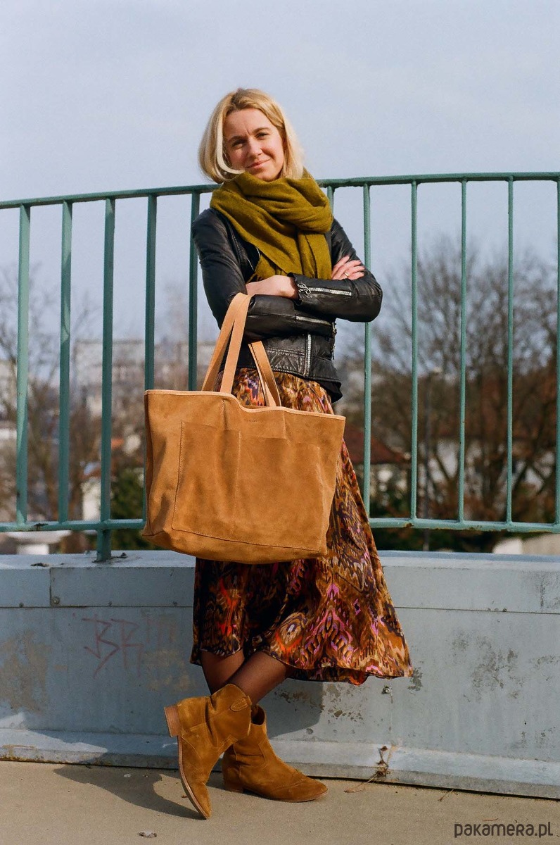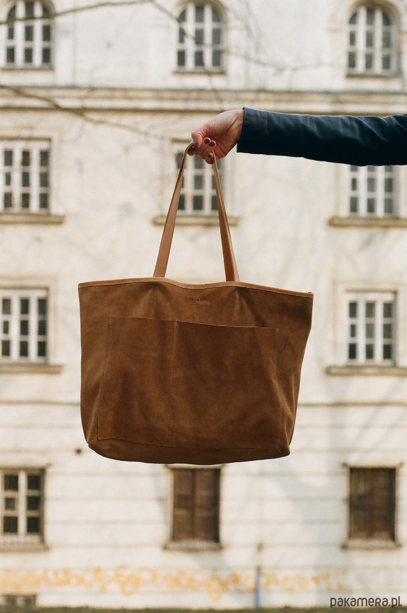 Uszy Lezamy są wykonane z podwójnej, licowej skóry w kolorze piaskowym i są doszyte do torby. Dno torby jest usztywnione drugą warstwą zamszu, dzięki czemu torba jest bardziej wytrzymała. Zamsz, z którego uszyto torbę, jest lejący i miły w dotyku, a sama torba swobodnie układa się na ramieniu, nie ograniczając ruchów.