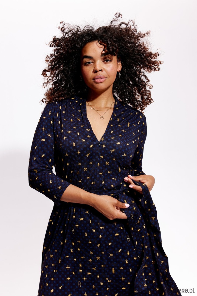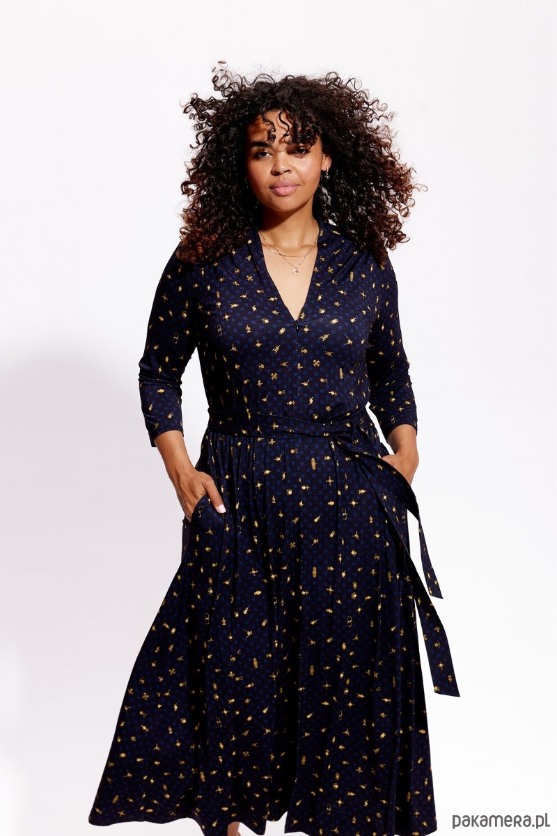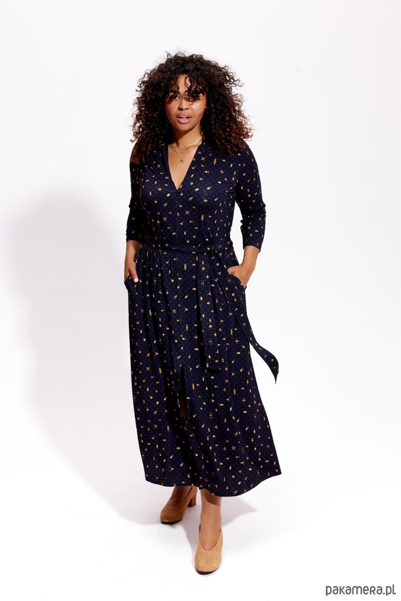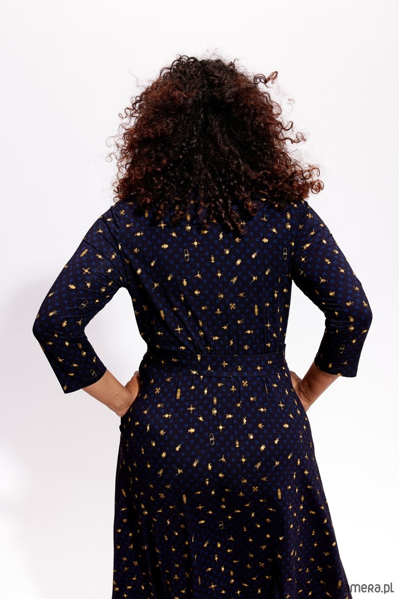Cicha woda brzegi rwie. Odcinana w talii sukienka wygląda jak uosobienie skromności, ale kiedy przyjrzysz się bliżej, dostrzeżesz rozporek z przodu, który sięga nieco nad kolano. A to nie wszystko, bo regulowany krytym zamkiem dekolt w serek też może się znacznie powiększyć. Dobra do kuszenia i do karmienia. Tę wersję Liberty Dress zdobi print „space dots”. Z daleka – klasyczne kropki, a z bliska – wszechświat pełen astralnych obiektów. Wzięłyśmy na warsztat popularny, dziewczęcy wzór i wysłałyśmy go w kosmos – rękami grafika Pawła Palikota. Inspirując się kolażami - „Tekstylnymi Obrazami” - słowackiego artysty Júliusa Kollera, Paweł zapełnił uniwersum kropkowanej dzianiny kosmicznymi kształtami: sztucznymi satelitami, sondami i innymi, istniejącymi tylko w jego wyobraźni. ;)