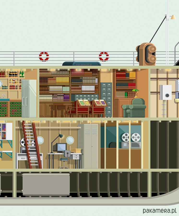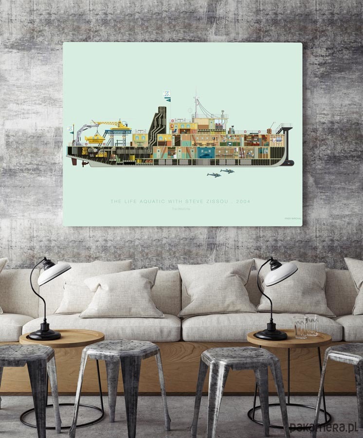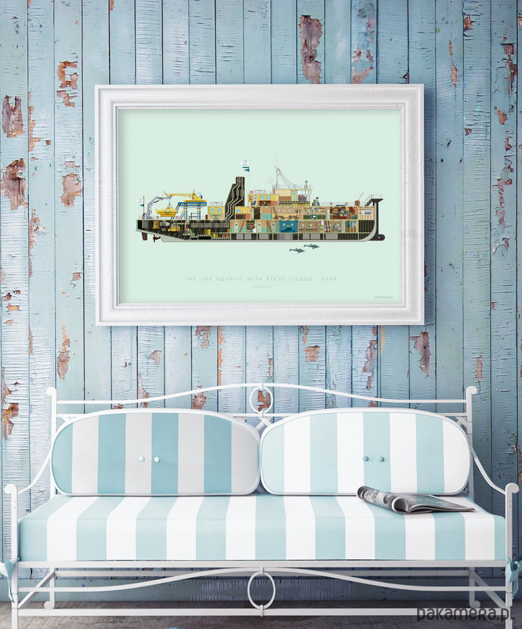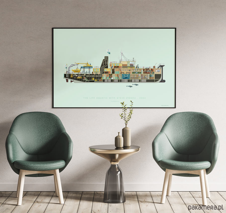 Plakat z autorską grafiką inspirowaną filmem "The Life Aquatic with Steve Zissou" (Podwódne życie ze Stevem Zissou). Pochodzi z serii "Famous Settings" i przedstawia okręt Belafonte.