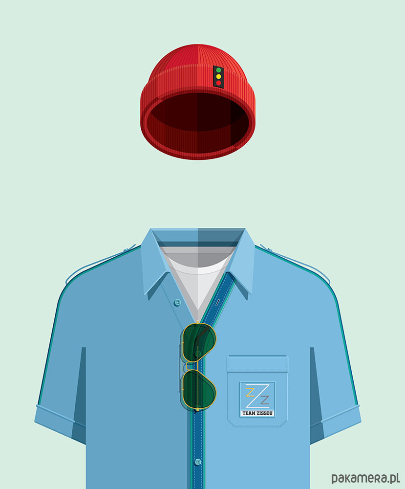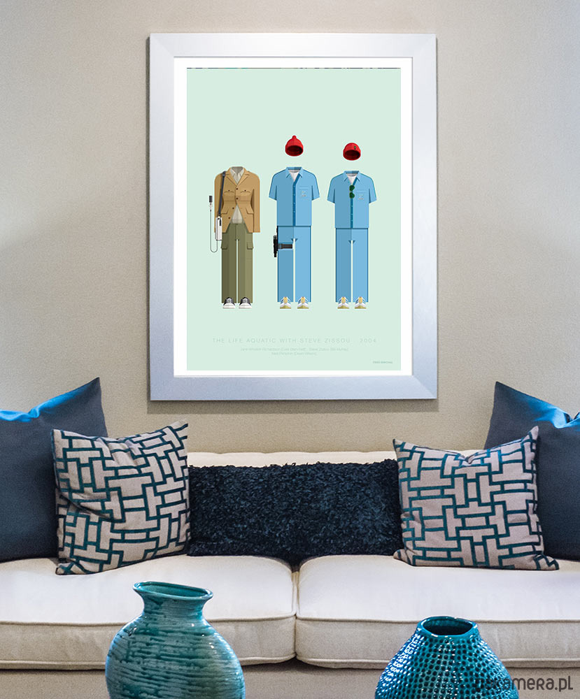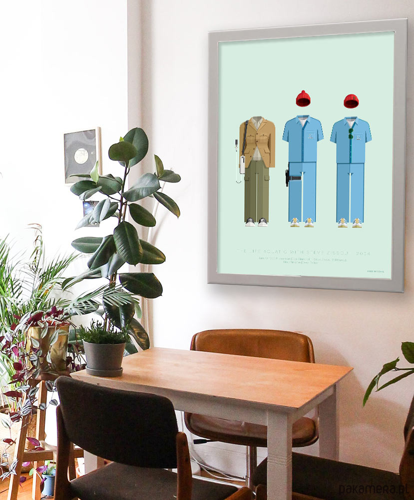 Plakat inspirowany filmem Podwodne Życie Ze Stevem Zissou (The Life Aquatic With Steve Zissou), reż. Wes Anderson. Plakat przedstawia kostiumy załogi okrętu Belafonte. Dwa dopasowane niebieskie stroje z charakterystycznymi czerwonymi czapeczkami Steve'a Zissou i Neda Plimtona, uzupełnia stonowany kostium dziennikarki Jane Winslett-Richardson granej przez Cate Blanchett.