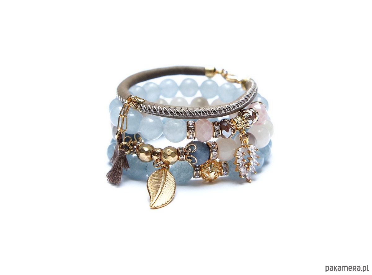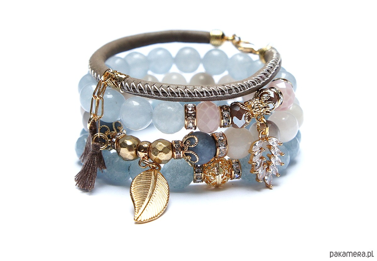 Komplet czterech bransoletek wykonanych z naturalnych kamieni: jadeity fasetowane [10mm], jadeity [10mm], marmur matowy [10mm], kryształki fasetowane [8 i 10mm], hematyt fasetowany, platerowany [8mm], rzemienia z naturalnej skórki, zawieszki wysadzanej cyrkoniami, chwostów oraz elementów metalowych w kolorze złota.