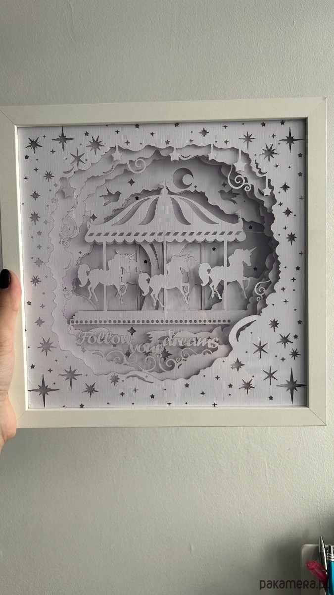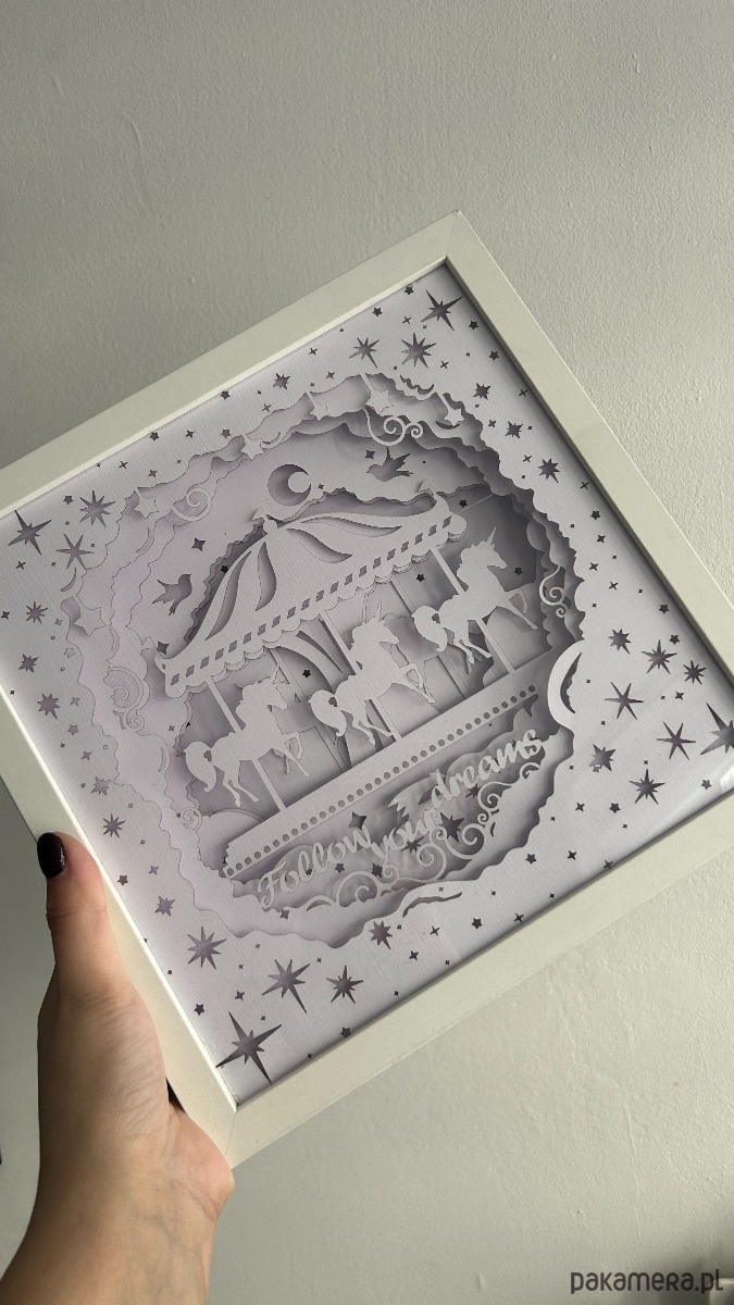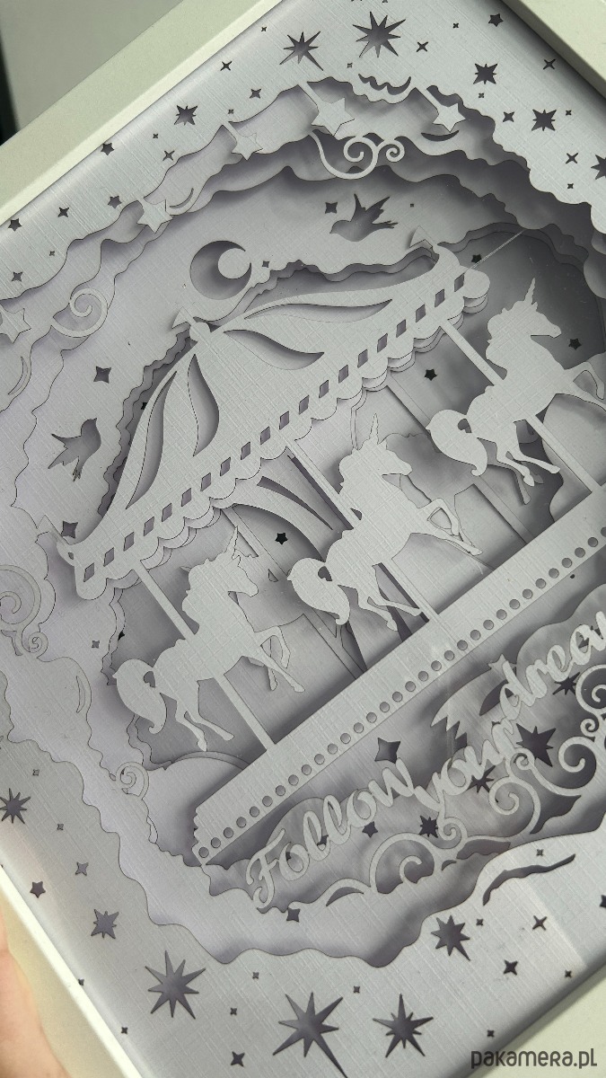 Ta niezwykła lampka typu lightbox została stworzona z myślą o wprowadzeniu do pokoju dziecka wyjątkowej, bajkowej atmosfery. Wykonana z precyzyjnie ułożonych warstw papieru, tworzy efekt głębokiego, wielowymiarowego cienia, dzięki czemu każda scena wygląda jak miniaturowy świat zamknięty w ramce. Subtelne podświetlenie LED podkreśla każdy detal, nadając ilustracji miękkie, kojące światło idealne do wieczornego wyciszenia.