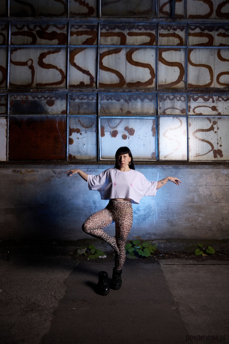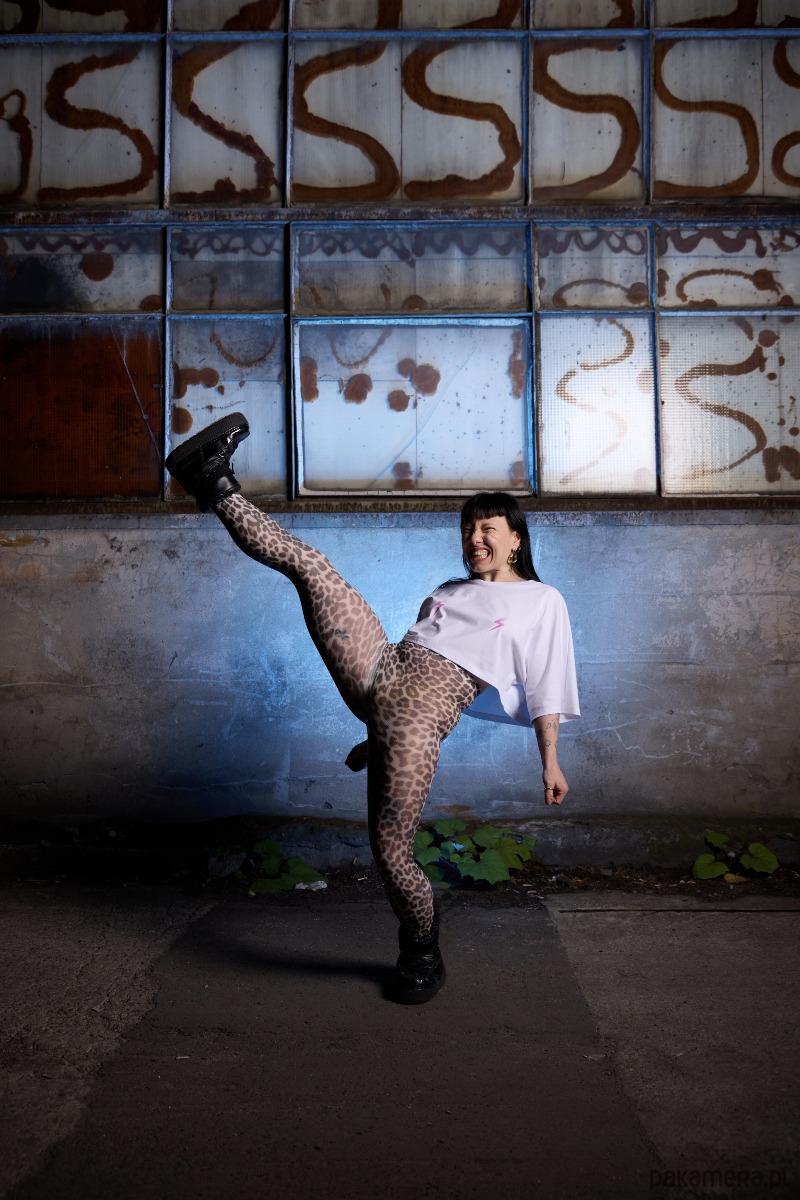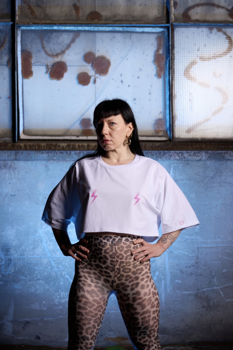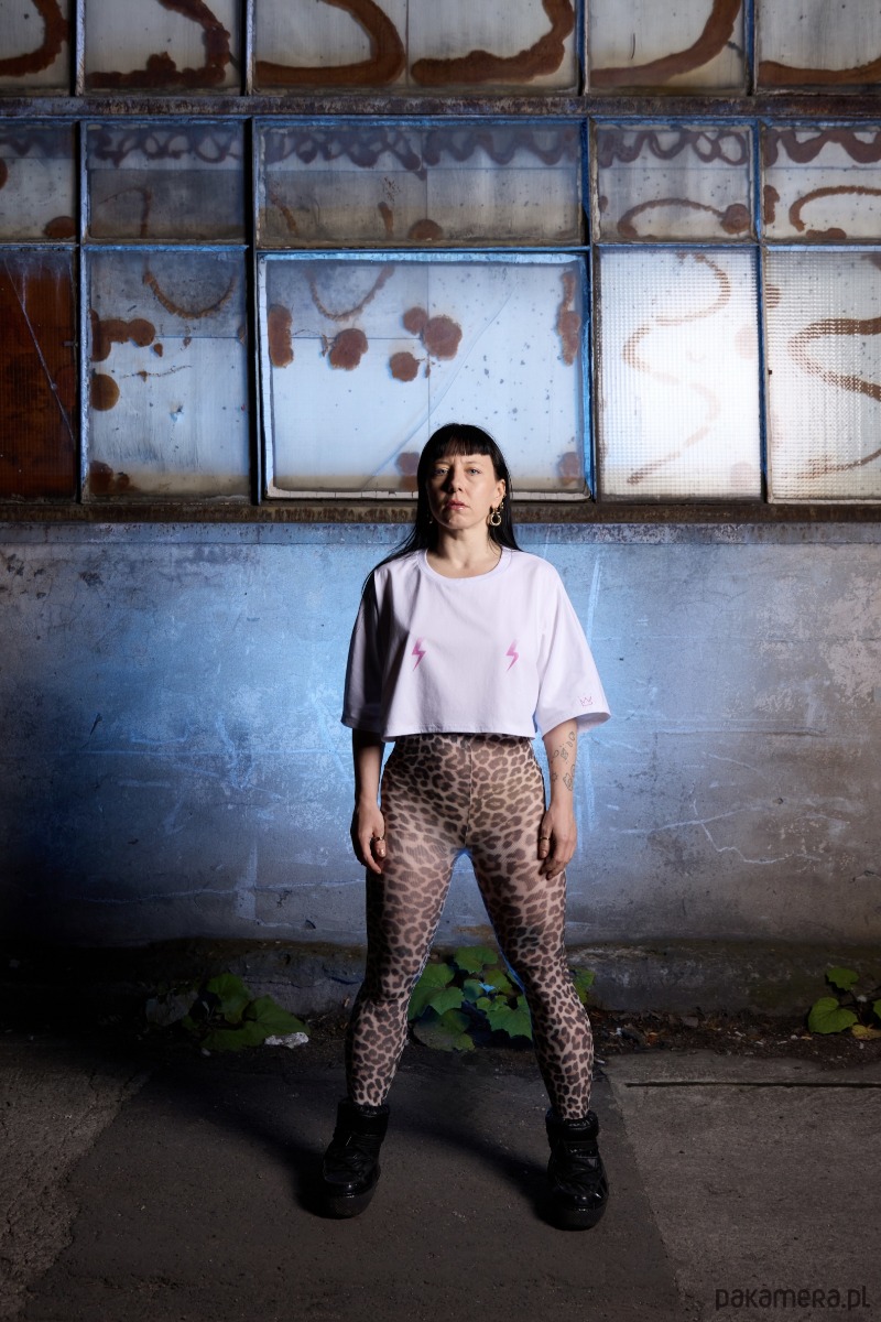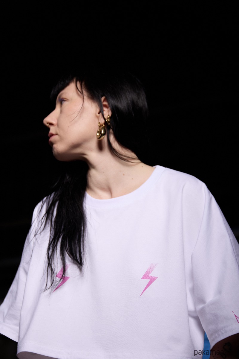 Na piersi dwie graficzne różowe błyskawice.