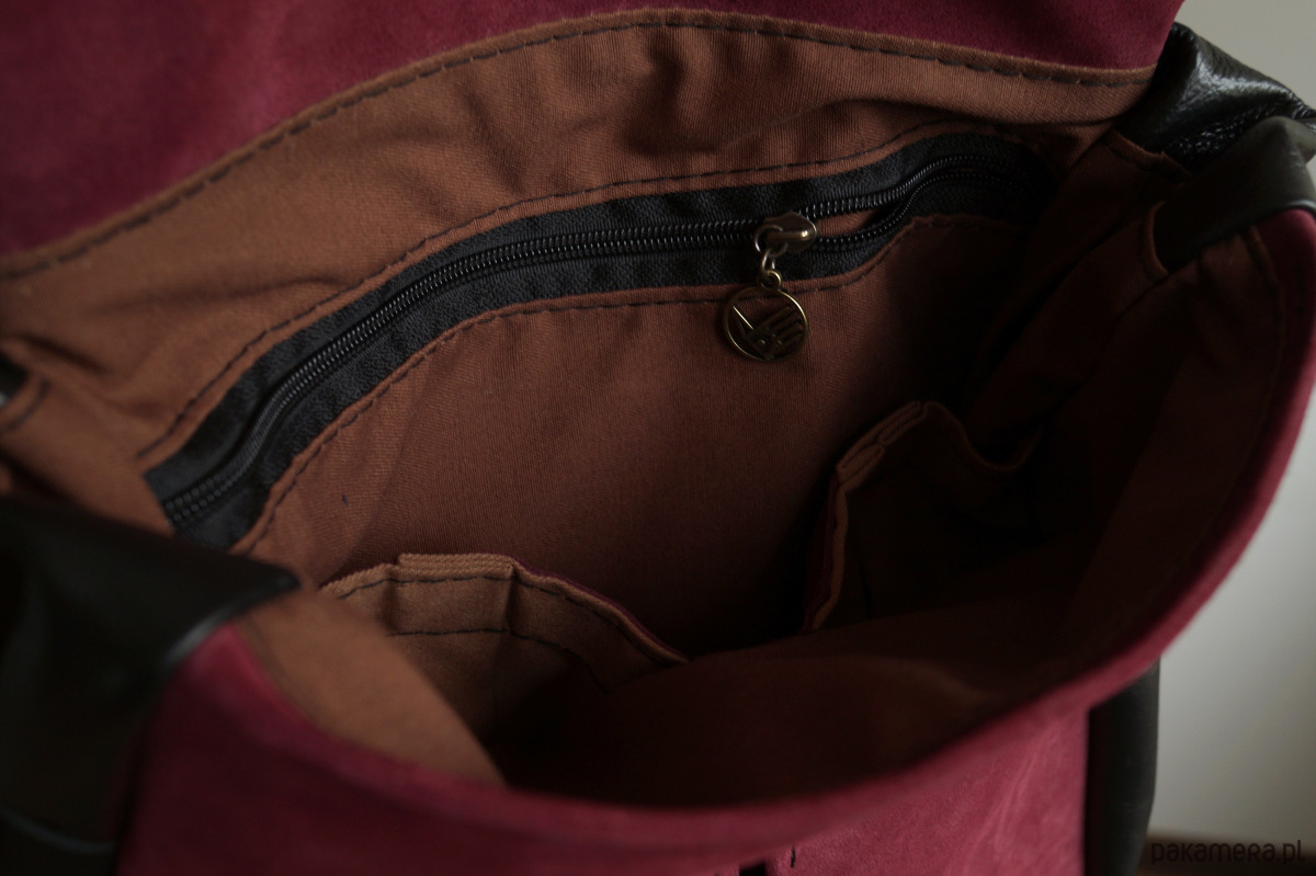 Wewnątrz kieszeń na zamek i dwie kieszenie otwarte.