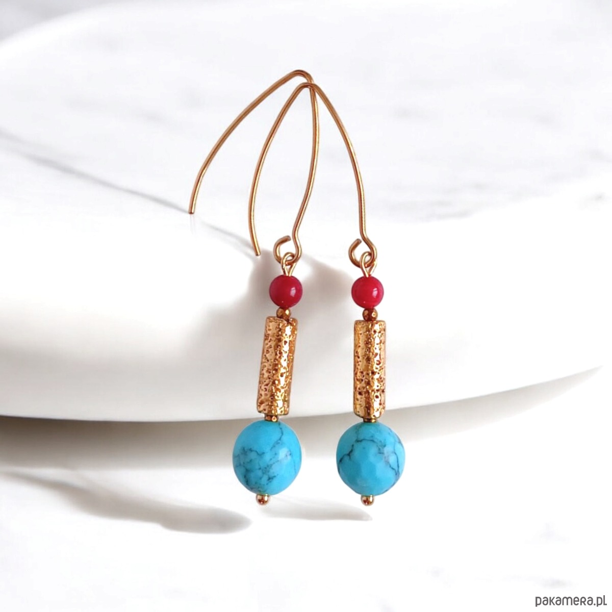Kolczyki zostały wykonane z kul fasetowanego howlitu (10mm), złotej lawy, czerwonego korala 4mm, przekładek ze złotego hematytu.