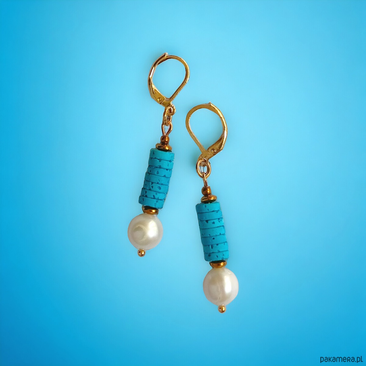 Kolczyki zostały wykonane z krążków turkusowej, porowatej lawy (ok.6mm), przepięknych , naturalnych pereł (ok. 10mm) przekładek ze złotego hematytu.