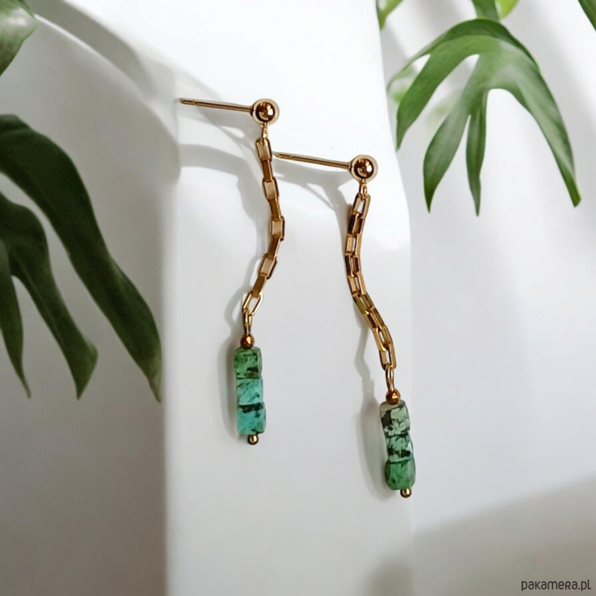 Kolczyki zostały wykonane z wielobarwnych, fasetowanych kosteczek naturalnego turkusu (4mm) , kuleczek złotego hematytu.