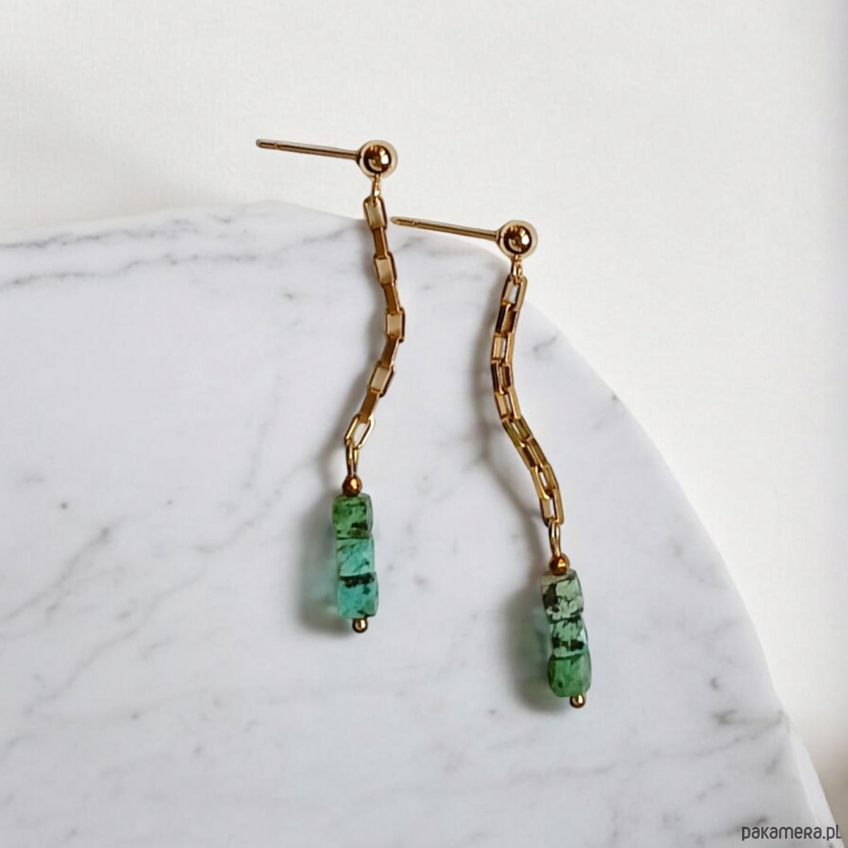 Kolczyki zostały wykonane z wielobarwnych, fasetowanych kosteczek naturalnego turkusu (4mm) , kuleczek złotego hematytu.
