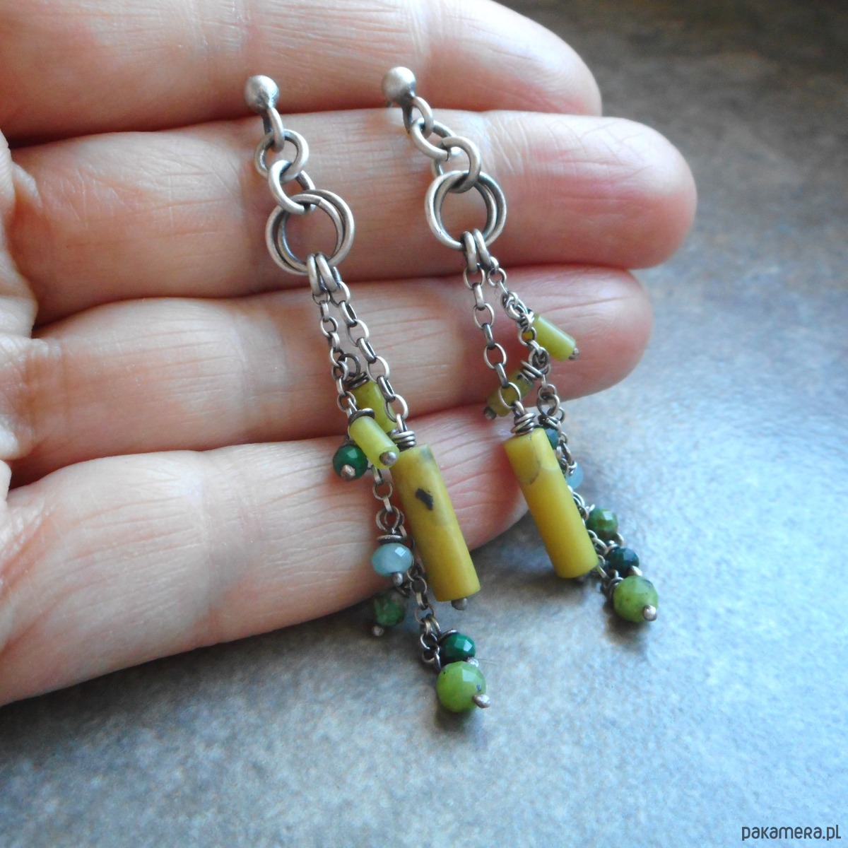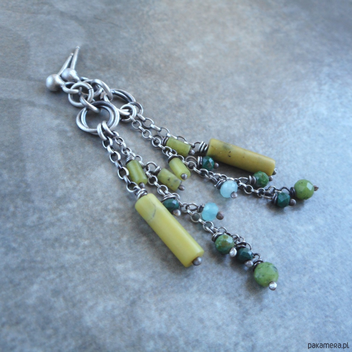 Kolczyki z kamieni naturalnych i szlachetnego srebra; lekkie, kolorowe, zawieszone na sztyftach tworzą zwiewną, niebanalną kompozycję.