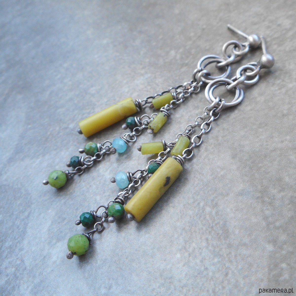 Kolczyki z kamieni naturalnych i szlachetnego srebra; lekkie, kolorowe, zawieszone na sztyftach tworzą zwiewną, niebanalną kompozycję.