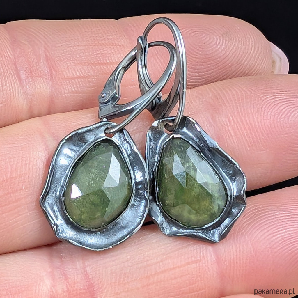 Kolczyki wykonane z oksydowanego srebra próby 925 oraz przepięknych, fasetowanych szafirów w limonkowym kolorze. Eleganckie, ponadczasowe. Długość całkowita z biglami 32 mm, wymiary elementów z kamieniami 18 x 15 mm. Waga jednego kolczyka 2,57 g. Kolczyki zostaną zapakowane w ozdobne pudełeczko.