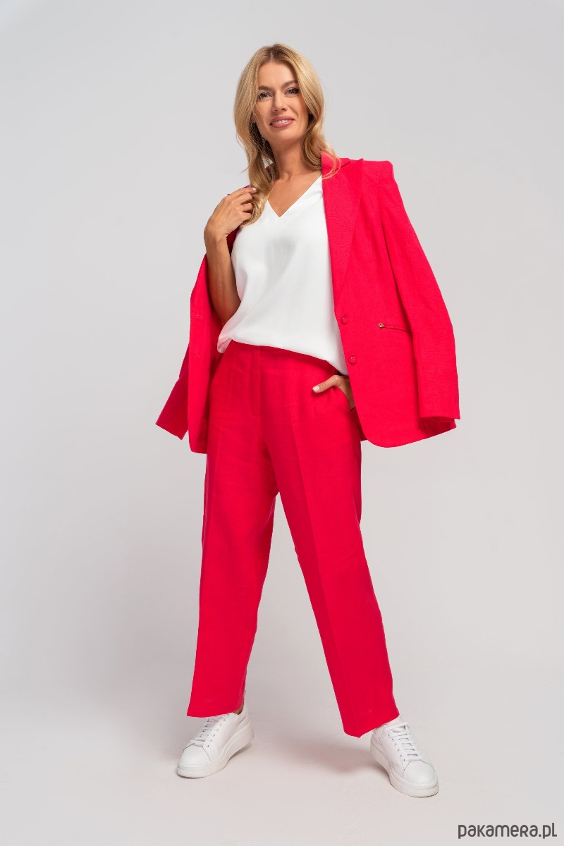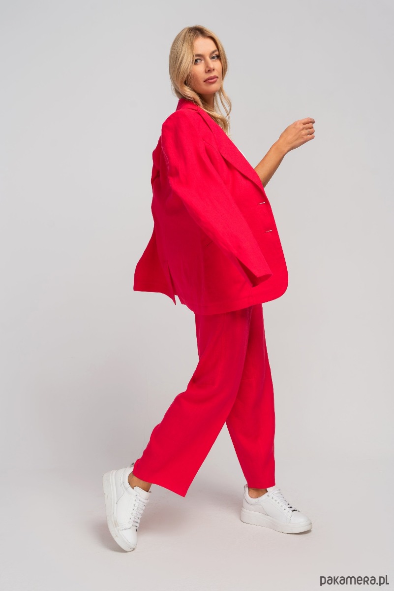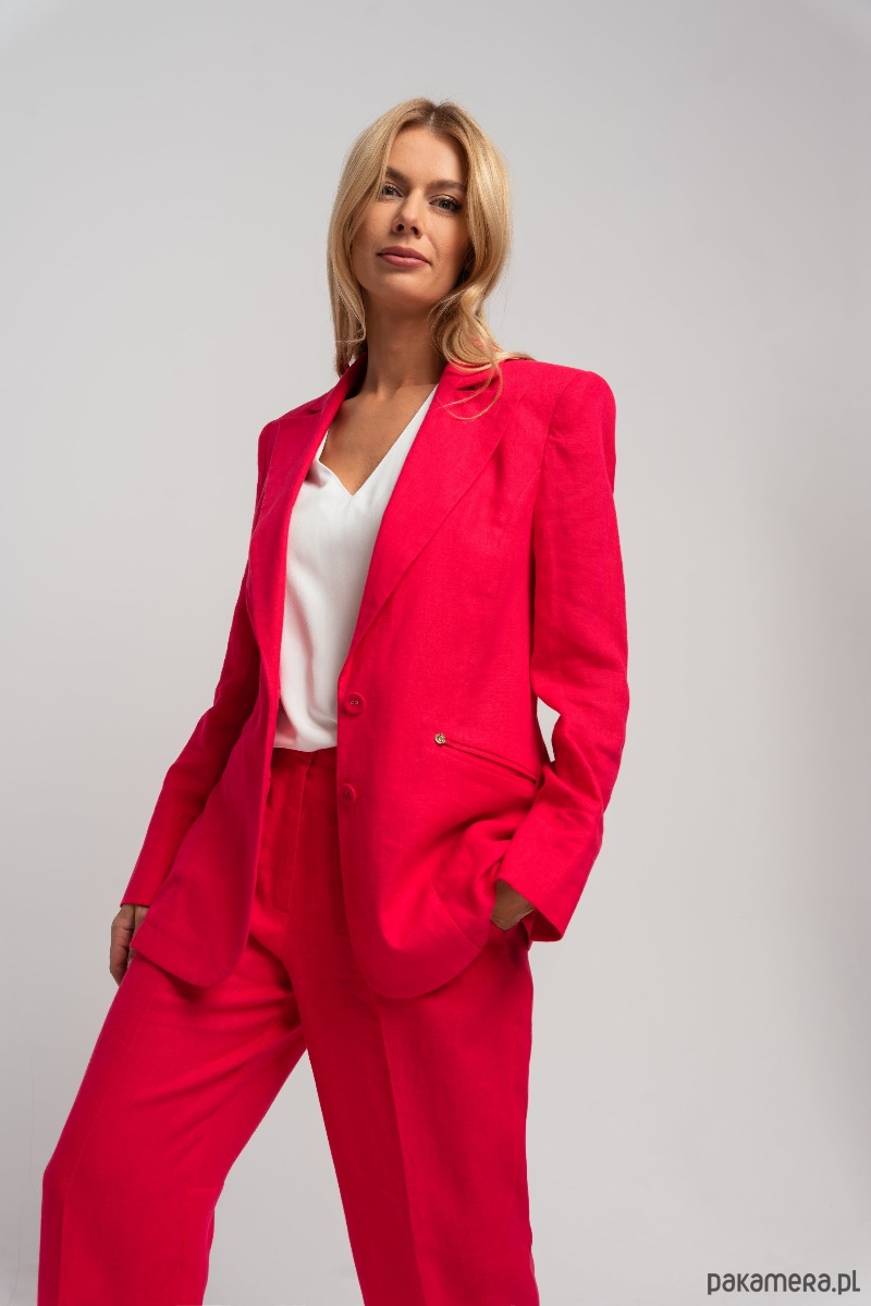 Lniana marynarka o luźnym kroju, zapinana na dwa oblekane guziki. Ramiona lekko usztywnione poduszkami. Duży wykładany kołnierz z klapami o zaostrzonym kształcie. Mankiety rękawów z rozcięciami. Na przodzie kieszenie z patkami, wpuszczone do wewnątrz. Żakiet posiada ozdobne, pionowe przeszycia oraz zakładki modelujące krój, dzięki czemu świetnie leży na sylwetce. Marynarkę zestawić można ze spodniami LIN, tworząc pasujący komplet lub nosić oddzielnie. Naturalna tkanina ze 100% lnu, jest bardzo przewiewna i przyjazna dla skóry, dzięki czemu będzie świetną, letnią alternatywą dla klasycznego garnituru. Fason sprawdzi się zarówno do casualowych i sportowych stylizacji oraz jako zestaw do pracy.