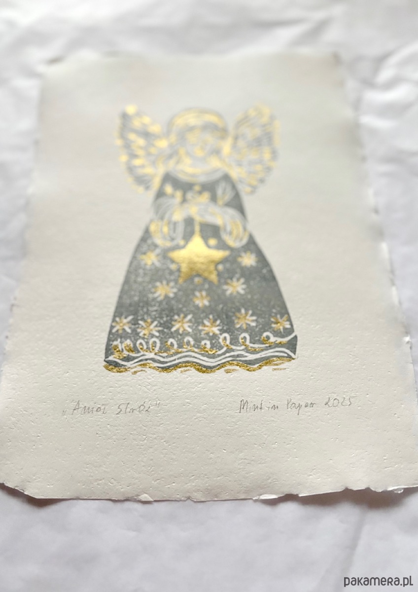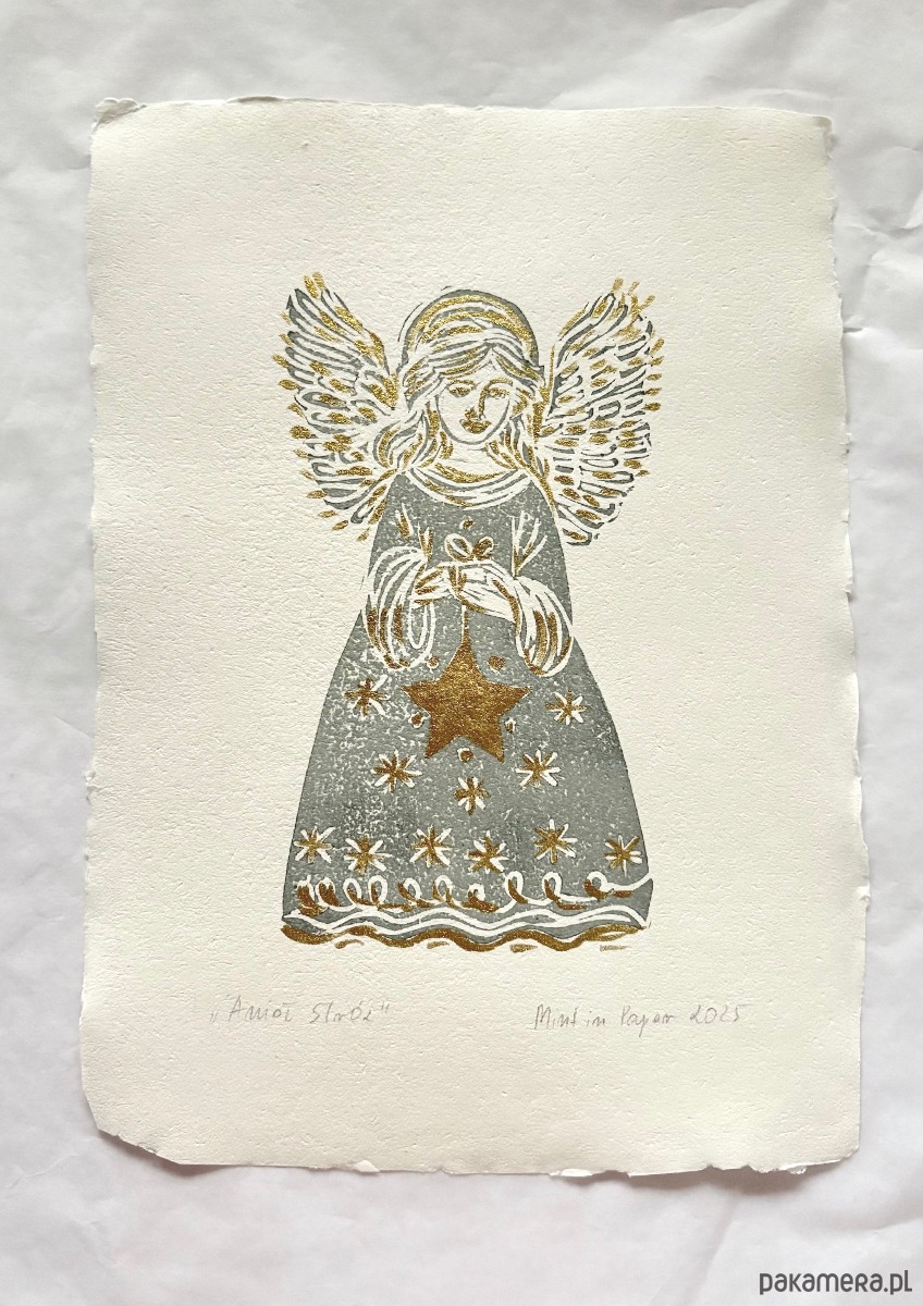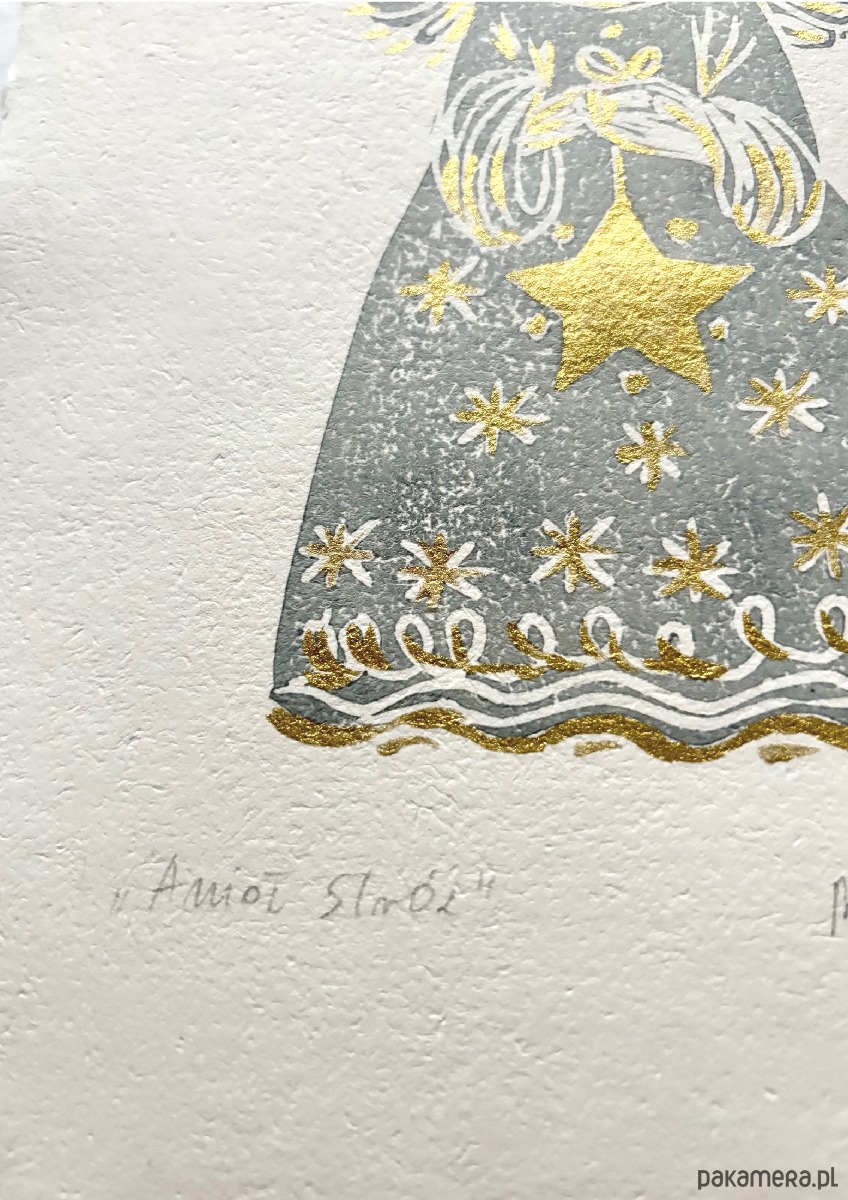 Linoryt przedstawiający Anioła w będzie idealnym prezentem na takie okazje jak narodziny dziecka, chrzest, komunia, ślub.