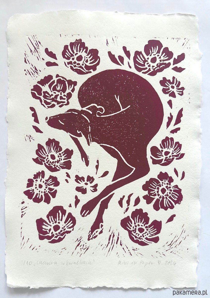 Linoryt przedstawiający śpiącego charcika w kwiatach będzie idealnym prezentem dla miłośników psów.