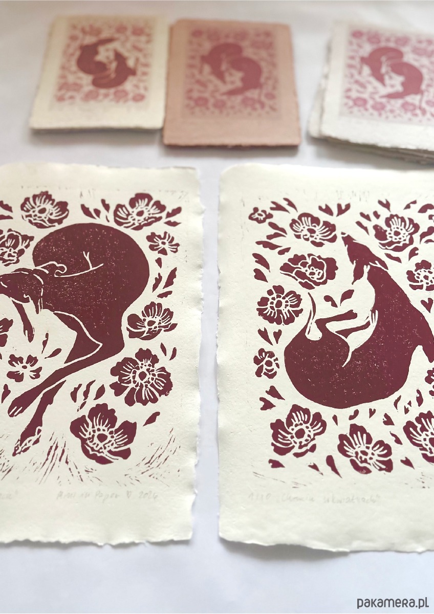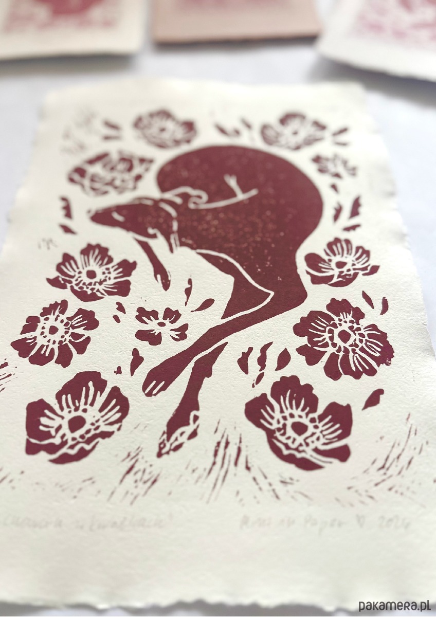 Ręcznie drukowany linoryt na czerpanym papierze graficznym w formacie A4.